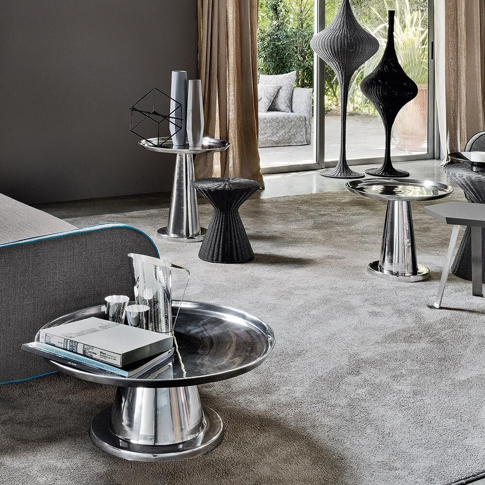 Die runde Tischplatte mit einem Durchmesser von 62 Zentimetern ist eine Meisterleistung der Formgebung. Die aufwärts gebogene Kante schützt die darauf stehenden Gegenstände vor dem Fall, während der stählerne Glanz an eine Weltraumfähre erinnert. Die italienische Designerin Paola Navone ist bekannt für ihre ausgefallenen und geschmackvollen Kreationen, die von der italienischen Tradition geprägt sind.