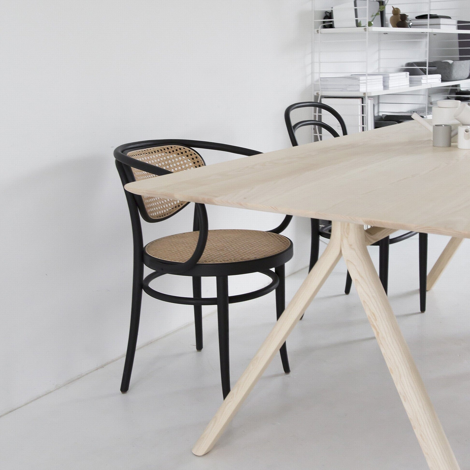 Das 210 R besteht aus hochwertigem Buchenholz, das in runde Formen gebogen und gebeizt wurde. Die Rundungen wiederholen sich in den Rücken- und Armlehnen sowie in einem Ring, der unter der Sitzfläche als Stabilisierung befestigt ist. Die vier leicht ausgestellten Beine gewährleisten einen sicheren Stand, während die an der Unterseite befestigten Kunststoffgleiter heikle Böden schonen. Ein eleganter Kontrast zu dem Rahmen aus dem Naturmaterial bilden die Rückenlehne und die Sitzfläche aus feinem Rohrgeflecht.