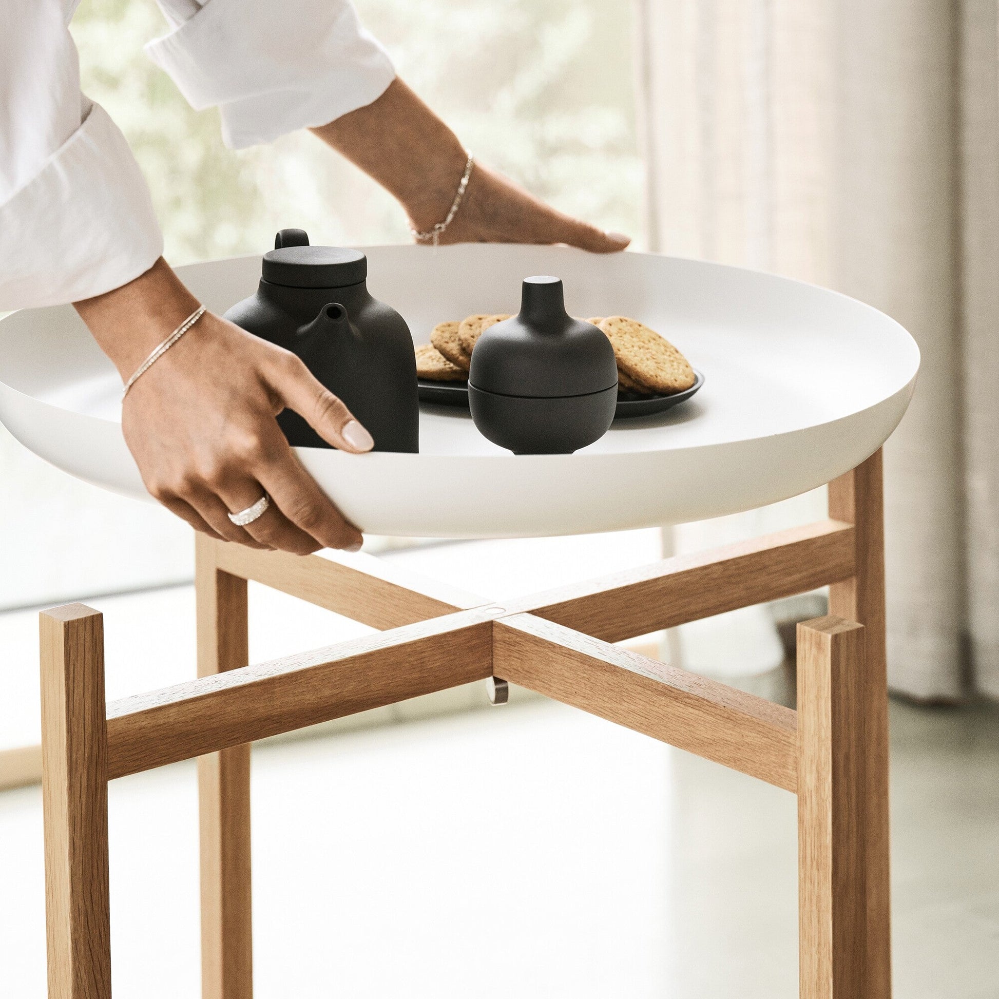Ein besonderes Detail des Tablo Beistelltisches H40cm ist die runde Tischplatte, die als praktisches Tablett mit einem hochgezogenen Rand gearbeitet wurde. Sie liegt auf dem Gestell mit vier Kantholzbeinen und einem mittigen Kreuzgestell auf. Die Enden der vier Beinstreben schließen bündig mit dem Tablettrand ab, sodass das Tablett leicht abgenommen und mit vorbereiteten Snacks und Getränken wieder auf dem Gestell arrangiert werden kann.