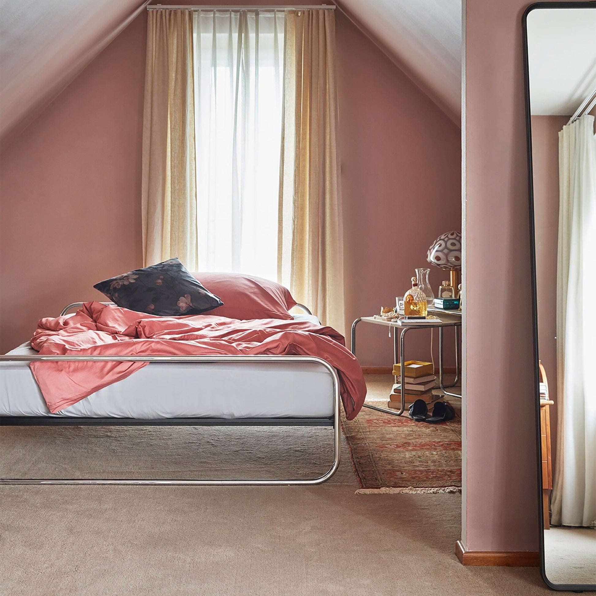 Das Roth Modell 455 Doppelbett ist ein Meisterwerk der Schweizer Design-Ikone Alfred Roth, das 1927 für die Marke Embru entworfen wurde. Obwohl es über 90 Jahre alt ist, behält es seine zeitlose Eleganz und Aktualität bei. Roth entwarf das Bett ursprünglich für die Corbusier-Häuser am Weissenhof in Stuttgart, wo es seine Präsenz beweisen musste. Eine der Herausforderungen war, dass es auf Kufen stehen sollte und in enge Nischen geschoben werden konnte.