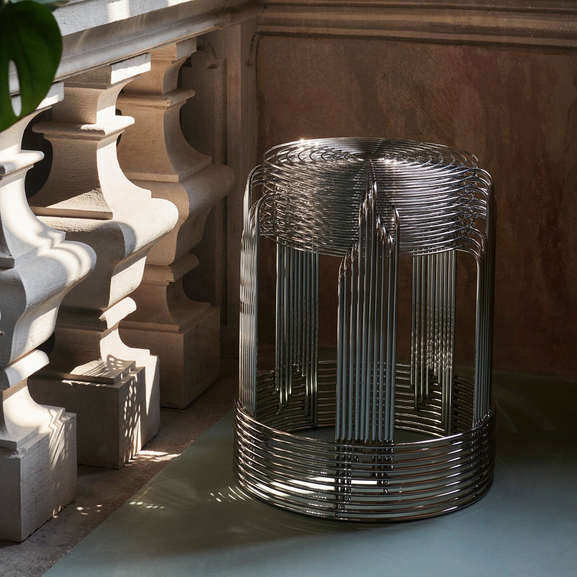 Der Wire VP11 Hocker ist nicht nur ein stilvolles Sitzmöbel, sondern auch ein begeisterndes Beistellmöbel. Zum Beispiel kann er als luftiger Tisch neben dem Sofa, einem Sessel oder neben dem Bett genutzt werden. Eine weitere Besonderheit ist, dass der Hocker stapelbar ist. Wenn mehrere Modelle übereinandergestapelt werden, entsteht ein einzigartiges Kunstobjekt, das das Spiel mit Form und Parallelität neu interpretiert.