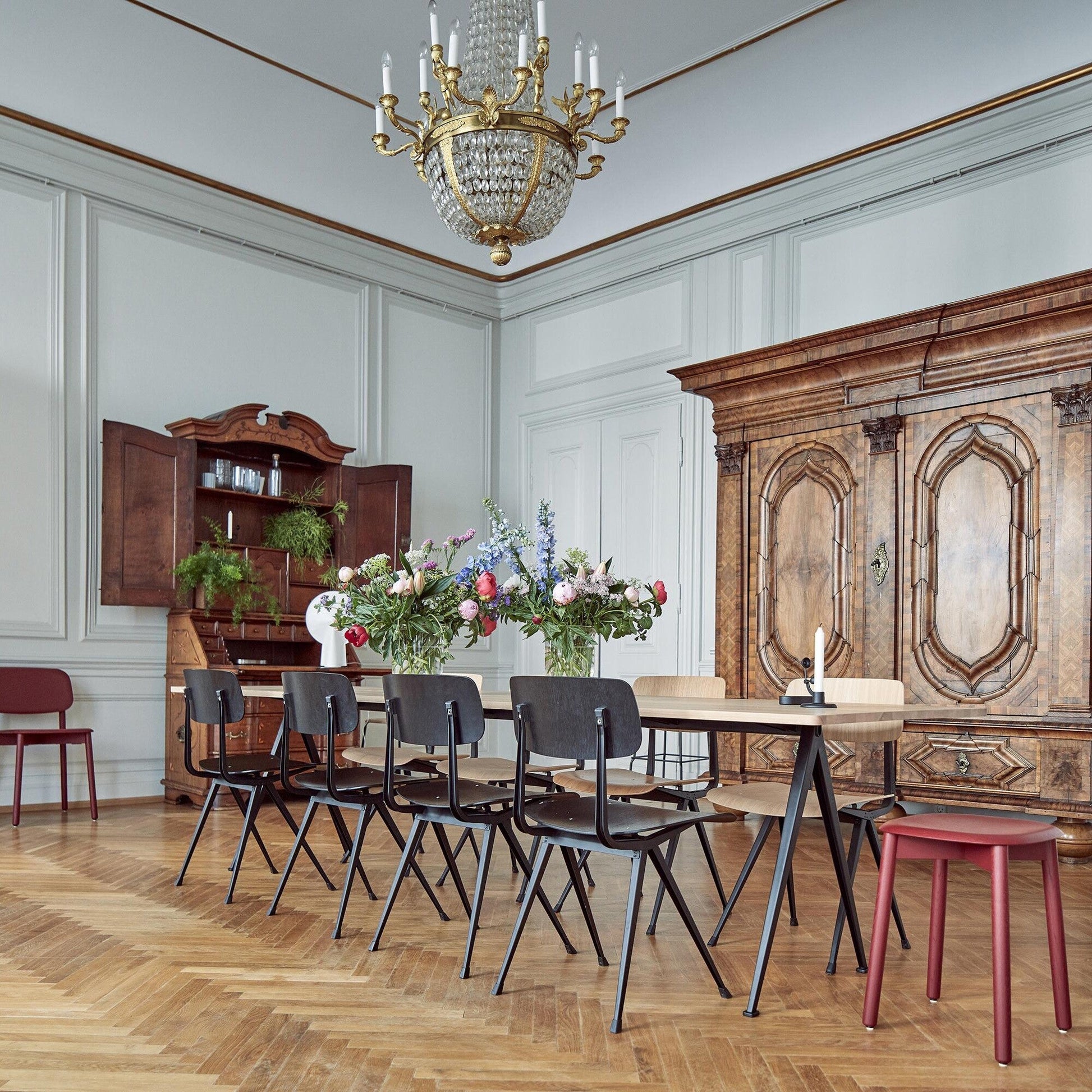 Die hochwertige Verarbeitung und die Verwendung von Eichenfurnier für die Sitzfläche und die Stuhllehne garantieren einen komfortablen Sitzplatz. Der Rahmen und die Stuhlbeine bestehen aus schwarz lackiertem Stahl, was dem Stuhl eine elegante und robuste Note verleiht. Die Farbpalette von HAY bietet vier verschiedene Varianten an, um den Result Stuhl individuell an die Einrichtung anzupassen: Eiche furniert und geräuchert, Eiche klar furniert, schwarz furniert oder matt furniert.