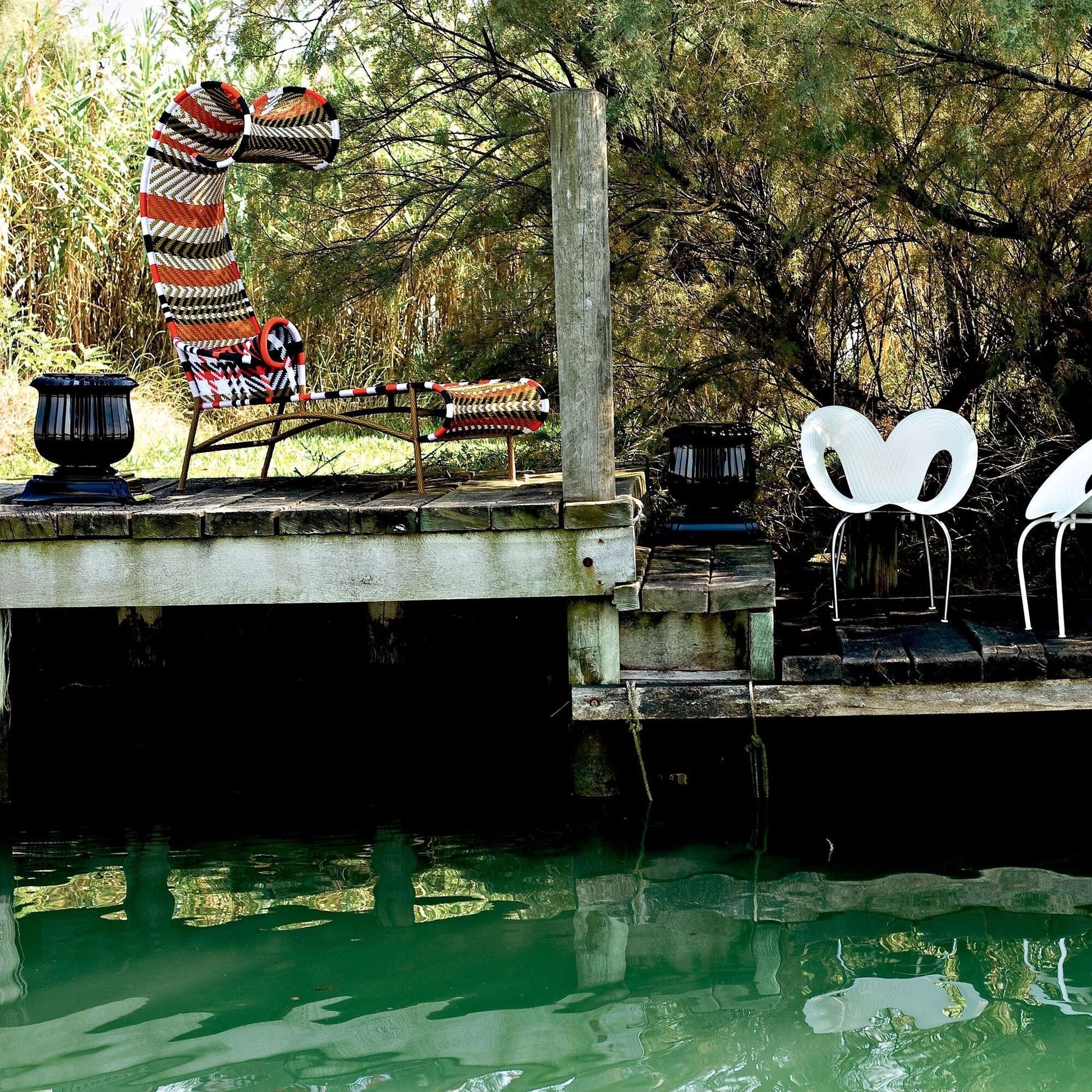 Die handgeflochtenen Fäden aus Polyurethan, die normalerweise für Fischernetze verwendet werden, machen diese Chaiselongue widerstandsfähig gegen Wind und Wetter. Der Charme dieser Kreation liegt jedoch nicht nur in ihrer Form, sondern auch im geschmackvollen Design, das an eine Hängematte erinnert. Die gedeckten, aber kräftigen Farben der Shadowy Chaiselongue sind ein echter Hingucker und werden sicherlich Ihren Garten oder Poolbereich mit einem Hauch von Exklusivität ausstatten.