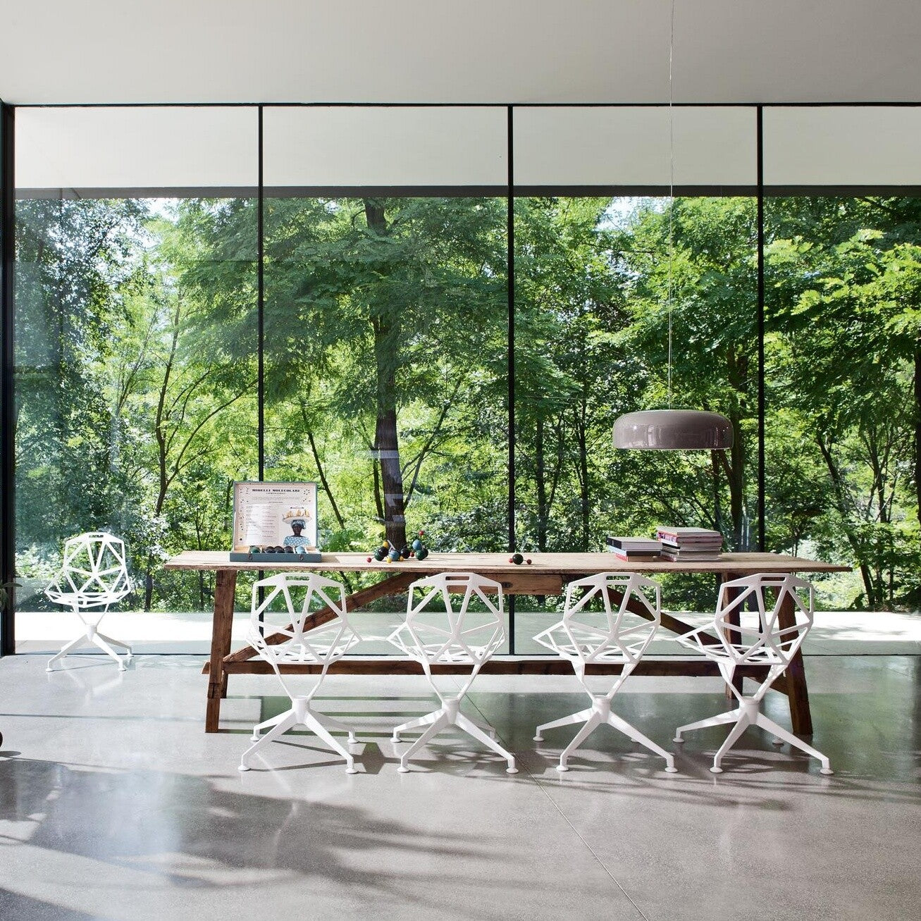 Der Chair One 4Star Drehstuhl Vierfußgestell - ein Meisterwerk der modernen Möbelkunst. Entworfen von Konstantin Grcic für die renommierte Marke Magis, präsentiert sich diese zeitlose Erfindung als perfektes Beispiel für Funktionalität und Stil. Die Nordic Swan-Zertifizierung unterstreicht die Nachhaltigkeit der Produktion, während der auffällige Sitz durch ein Druckgussverfahren entsteht, bei dem filigrane Streben zu einem geometrischen Muster zusammengesetzt werden.