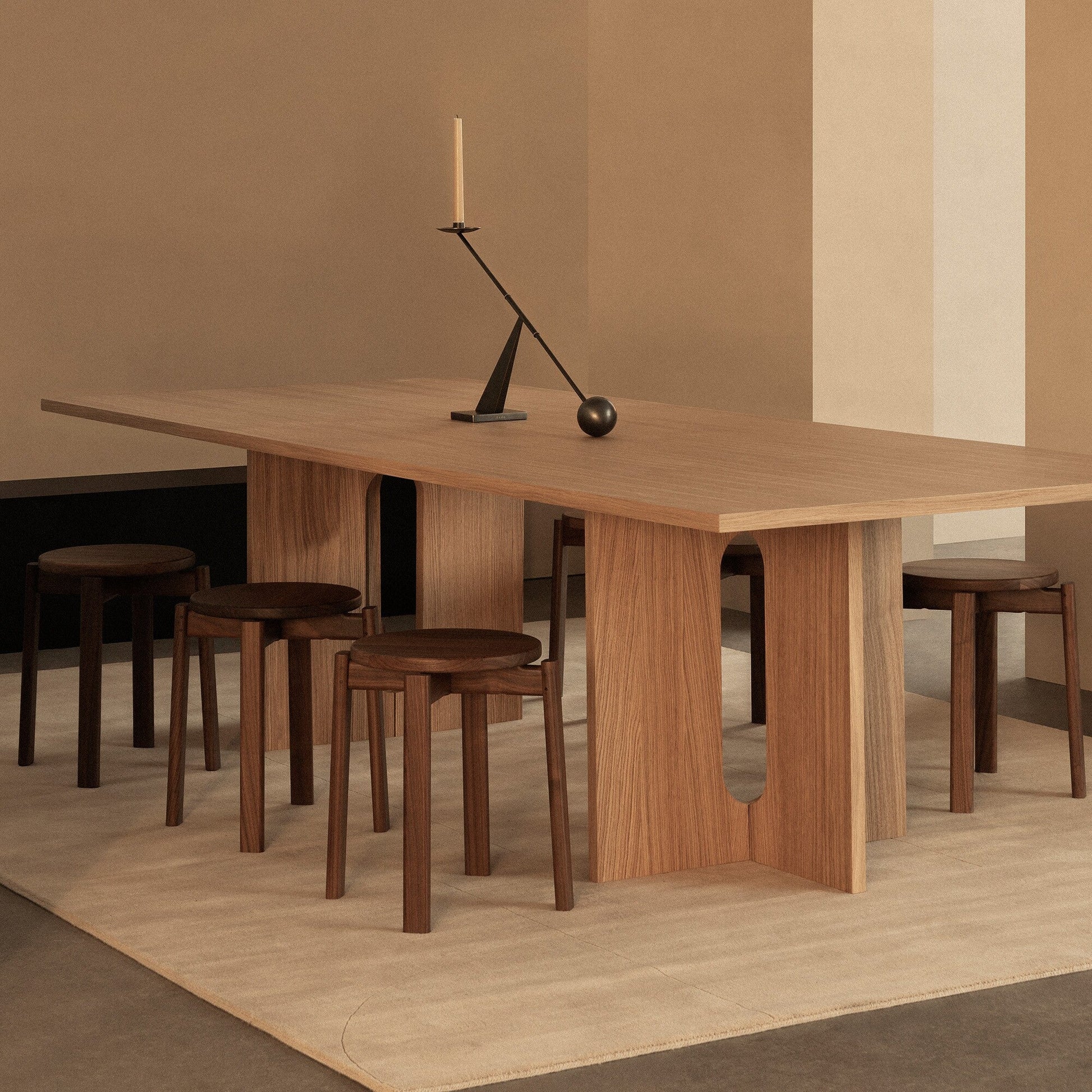 Der Passage Hocker ist ein Meisterwerk des dänischen Designstudios Studio Krøyer-Sætter-Lassen, das für die Marke Audo geschaffen wurde. Ein Paradebeispiel für die skandinavische Formsprache, der Passage Hocker zeichnet sich durch seine Purismus und Vielseitigkeit aus. Vier rechteckige, leicht abgerundete Beine tragen das Gestell für die kreisrunde Sitzfläche, die mit einem Durchmesser von 33cm etwas schmaler gearbeitet ist als das Gestell. Dies wirft die Beine aus der Draufsicht in einem schönen Detail hervor. Der Gesamtdurchmesser des Hockers beträgt 42,5cm und er hat eine Höhe von 46,5cm. Der Passage Hocker ist komplett aus Massivholz gearbeitet und steht in zwei Variationen zur Auswahl: einer aus lackiertem Walnussholz und einer aus lackiertem und FSC-zertifiziertem Eichenholz. Sein leichtes Gewicht von 3,8kg macht ihn flexibel einsetzbar und ideal als Fußhocker in Ergänzung zum Lieblingssessel. Er findet ebenso Verwendung als kleiner Beistelltisch neben dem Sofa oder als zusätzliche Sitzmöglichkeit für Gäste. Bei Nichtgebrauch ist der Hocker stapelbar und kann dadurch platzsparend verstaut werden. Der Passage Hocker ist Teil der Serie Passage von Audo, die auch einen Hocker mit gepolsterter Sitzfläche und Barhocker im identischen Design umfasst.
