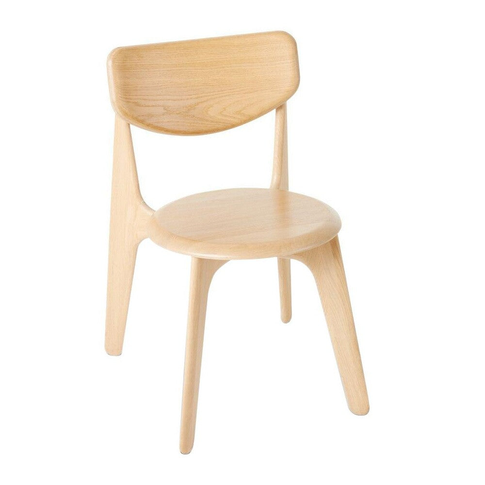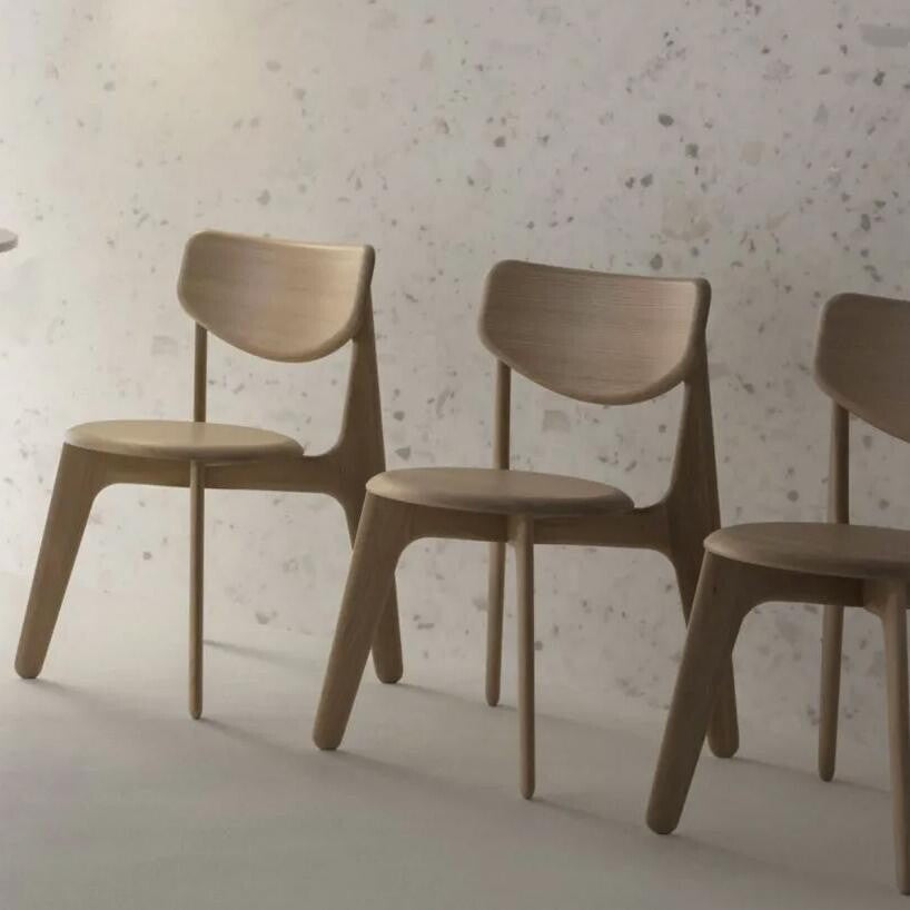 Das besondere Design des Slab Stuhls liegt in seinen vier Beinen, die schräg zueinander montiert sind und sich unter der Sitzfläche kreuzen. Die hinteren, ausgestellten Beine sind bis nach oben hochgezogen und tragen die Rückenlehne, die an der Unterseite rund und an der Oberseite gerade geformt ist. Der Stuhl besteht aus hochwertigem Eichenholz, das eine natürliche Maserung aufweist, und wird gerne im Wohn- oder Esszimmer eingesetzt. Auch in Restaurants, im Konferenzraum oder Veranstaltungsbereich macht der Slab Stuhl eine gute Figur.