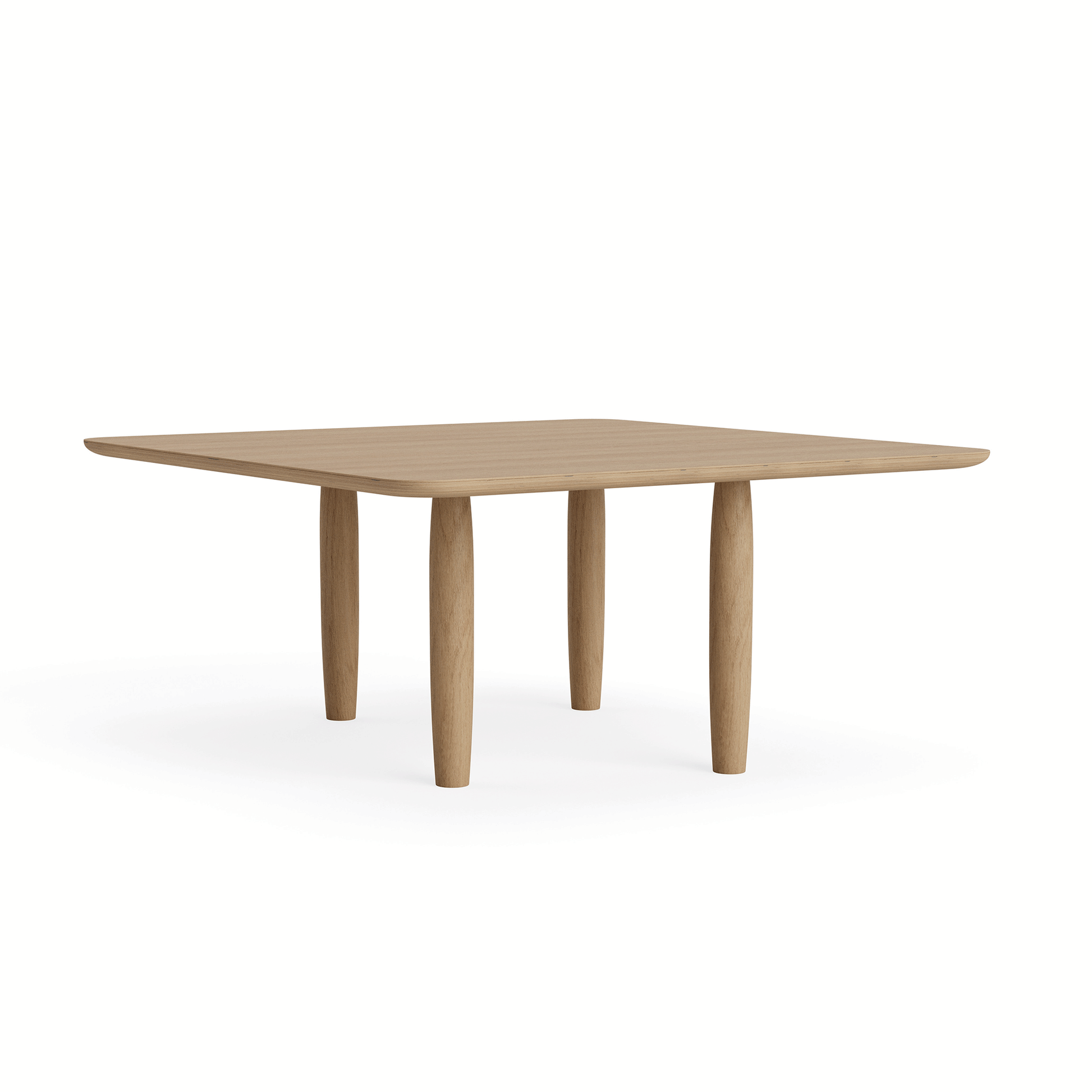 Die vier nach innen versetzten Beine des Couchtisches sind ein besonderes Merkmal. Sie sind aus gedrechselten Eichenholzteilen gefertigt und leicht bauchig geformt, was ihnen eine einzigartige Ästhetik verleiht. Die massive quadratische Tischplatte hat abgerundete Ecken und eine abgeschrägte Kante, die nicht nur optisch ansprechend sind, sondern auch eine stabile Basis für den Tisch bieten.