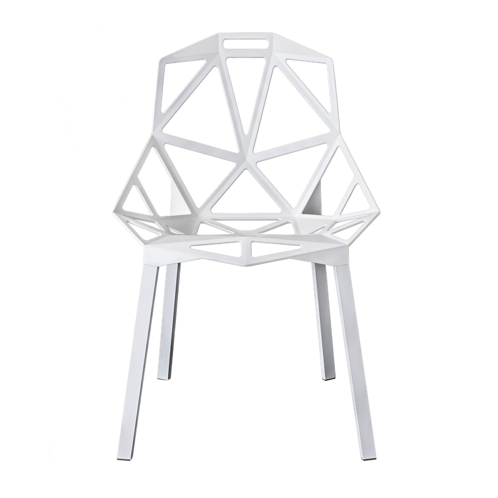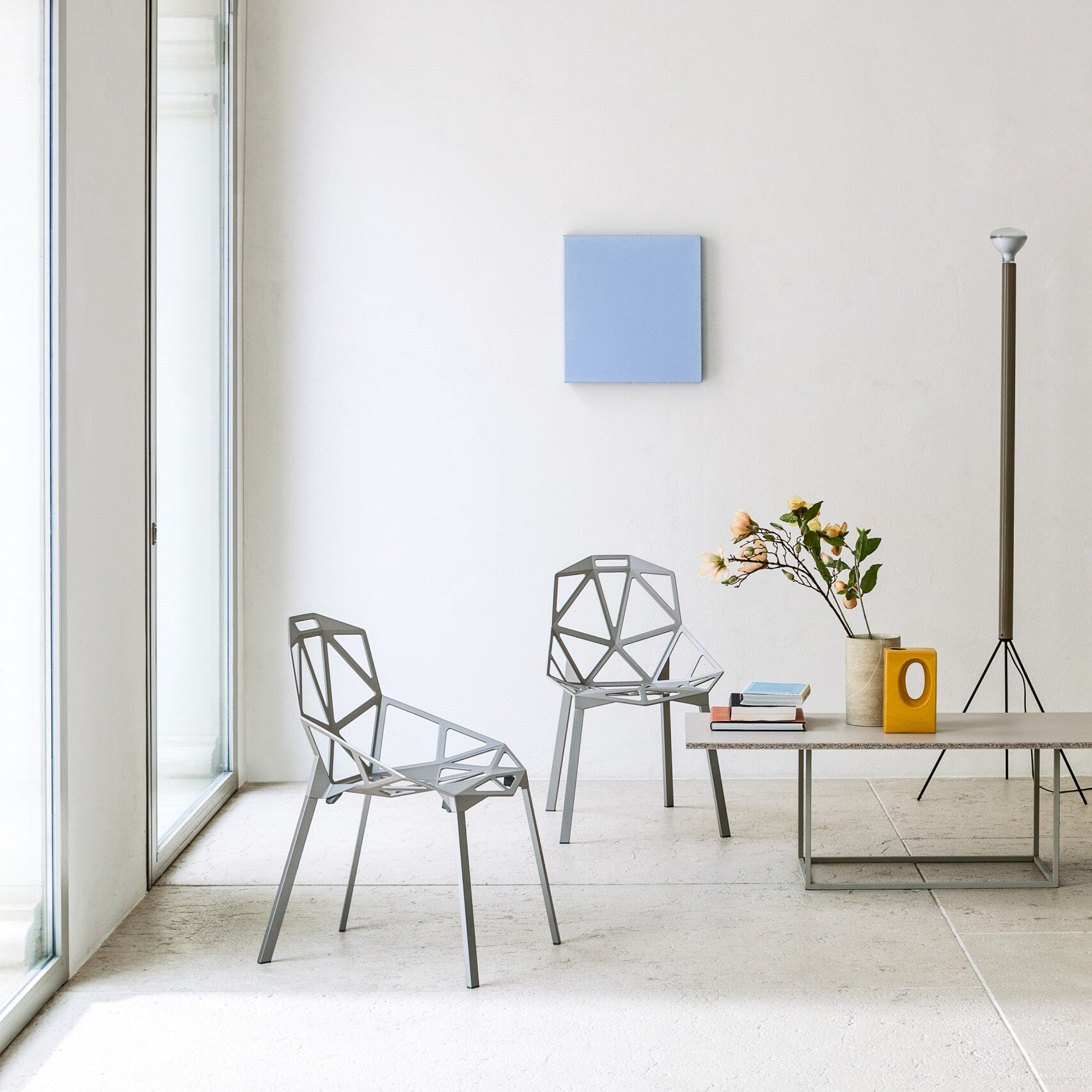 Wenn man den Chair One Stuhl stapelbar von der Seite betrachtet, erkennt man eine Struktur, die an einen Fußball erinnert. Dies ist kein Zufall, sondern das Ergebnis von unzähligen Skizzen, Kartonmodellen und Prototypen, die Grcic im Jahr 2003 entwickelte, bevor das Modell endgültig vorgestellt wurde. Die Sitzschale besteht aus Aluminium und wird in einem aufwendigen Druckgussverfahren hergestellt, wobei die Streben in einem geometrischen Muster angeordnet sind. Die deutlich ausgestellten Beine bestehen aus Profilaluminium und sind wetterfest, sodass der Stuhl sowohl im Indoor- als auch im Outdoorbereich verwendet werden kann.