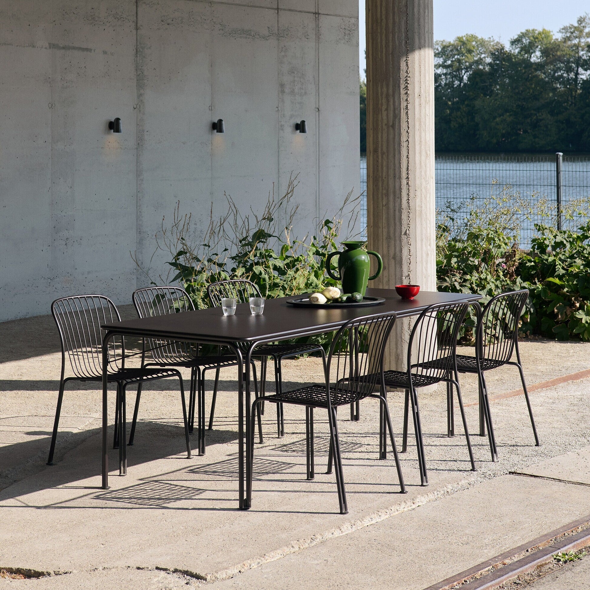 Der Thorvald SC99 Esstisch, entworfen von Space Copenhagen für &Tradition, ist ein Meisterwerk der funktionellen Eleganz. Mit seiner langen, schlanken Tischplatte bietet er großzügigen Platz für gesellige Runden im Freien. Die sanft abgerundeten Kanten verleihen ihm eine angenehme Optik, während die seidenmatte Oberfläche eine edle Haptik erzeugt. Das Gestell, bestehend aus vier gebogenen Rundstahl-Doppelstützen, sorgt für maximale Stabilität und Beinfreiheit. Durch die clevere Konstruktion ist der Tisch sowohl leicht als auch besonders robust.