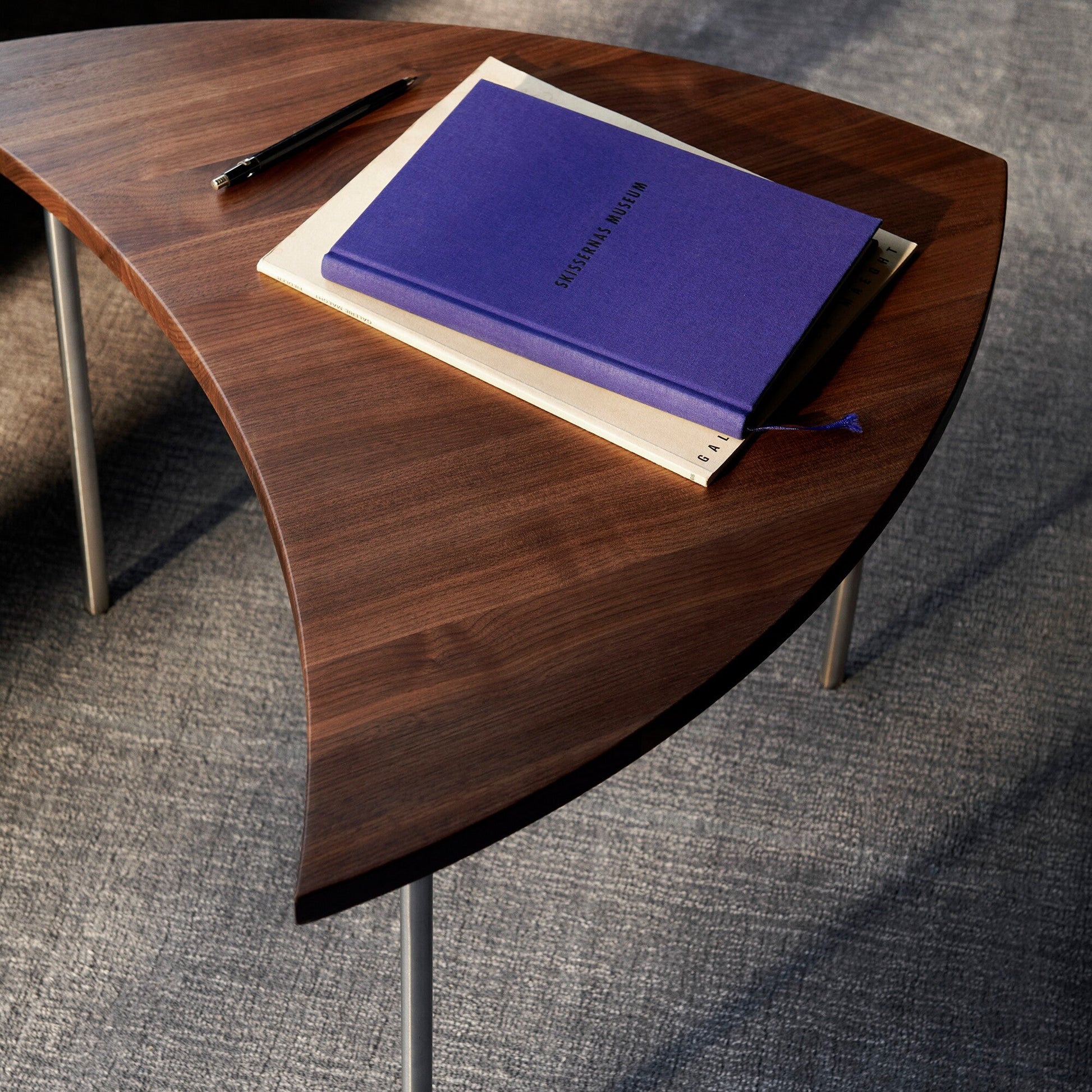 Der Pinwheel HM7 Beistelltisch ist so konzipiert, dass er sich jedem Umfeld anpasst. Seine einzigartige Tischplatte ist dreieckig geformt, mit zwei außen gewölbten Seiten und einer innen gewölbten unteren Seite. Die Tischplatte besteht aus hochwertigem Eichen- oder Walnussholz und wird mit einer geölten oder geseiften Oberfläche versehen. Ein interessanter Kontrast zum massiven Naturmaterial bilden die drei geraden Füße, die mit Kunststoffgleitern an der Unterseite befestigt sind. Das Gestell des Pinwheel HM7 Beistelltischs besteht aus Edelstahl und bietet eine elegante Note zu dem gesamten Design.