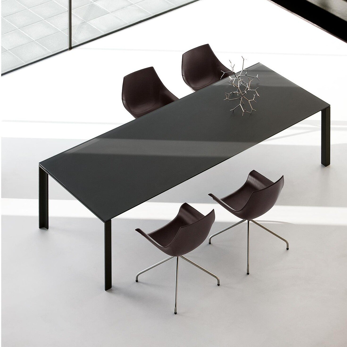 Das Tischgestell besteht aus stabilen und massiven Aluminium, während die Tischplatte in HPL Fenix hergestellt ist - einem innovativen Material, das aufgrund seiner intelligente Eigenschaften und seiner besonderen Oberfläche, die sich samtig und weich anfühlt, ideal für den Einsatz in luxuriösen Räumen ist. Die matte Oberfläche ist nicht nur pflegeleicht und kratzfest, sondern weist auch Fingerabdrücke ab.