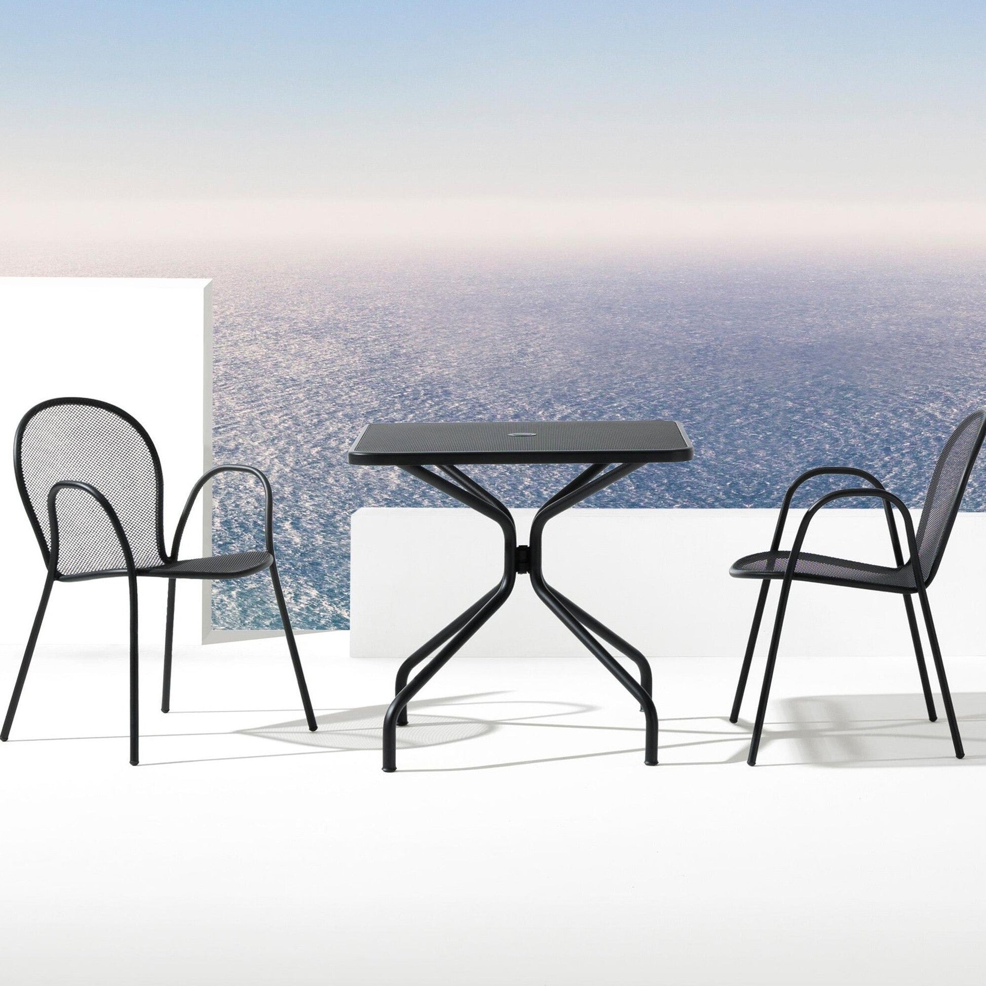 Ein markantes Merkmal dieses atemberaubenden Gartenmöbels sind die großzügigen Biegungen seiner Rücken- und Armlehnen. Das Gestell besteht aus gebogenem Rundstahl, der Sitzfläche und Rückenlehne zu einem ergonomisch geformten Teil zusammenfasst. Die Stuhlbeine gehen paarweise in die Armlehnen über, wodurch ein stabiler Stand des Stuhls gewährleistet ist, während gleichzeitig eine bequeme Stütze für die Arme ermöglicht wird. Der Sitz ist mit einem feinmaschigen Lochblech bespannt, das dem Körper eine feste, aber gleichzeitig elastische Unterlage bietet. Dank seiner pulverbeschichteten Oberfläche zeichnet sich der Ronda Gartenarmlehnstuhl durch eine lange Robustheit aus.