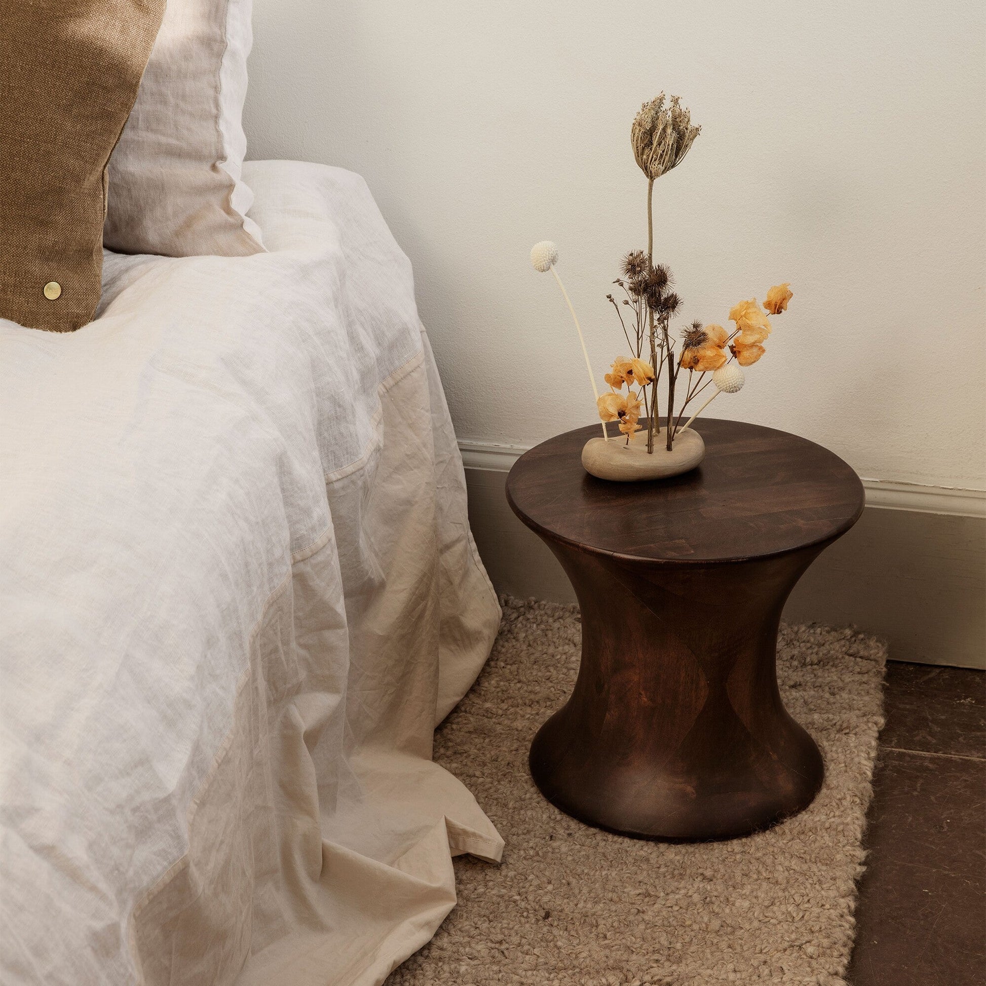 Mit seinem dunklen Material und der unverwechselbaren Form eines Hyperboloids ist der Spin Hocker ein echtes Edelstück für den Wohnraum. Der Rotationskörper besteht aus hochwertigem Mahagoniholz, das aus nachhaltiger Produktion stammt, und bietet dank seiner massiven Bauweise eine hohe Stabilität. Die weichen Rundungen des Möbelstücks verleihen ihm eine moderne Optik, während die natürliche Maserung des Holzes jedes Modell zu einem einzigartigen Unikat macht.