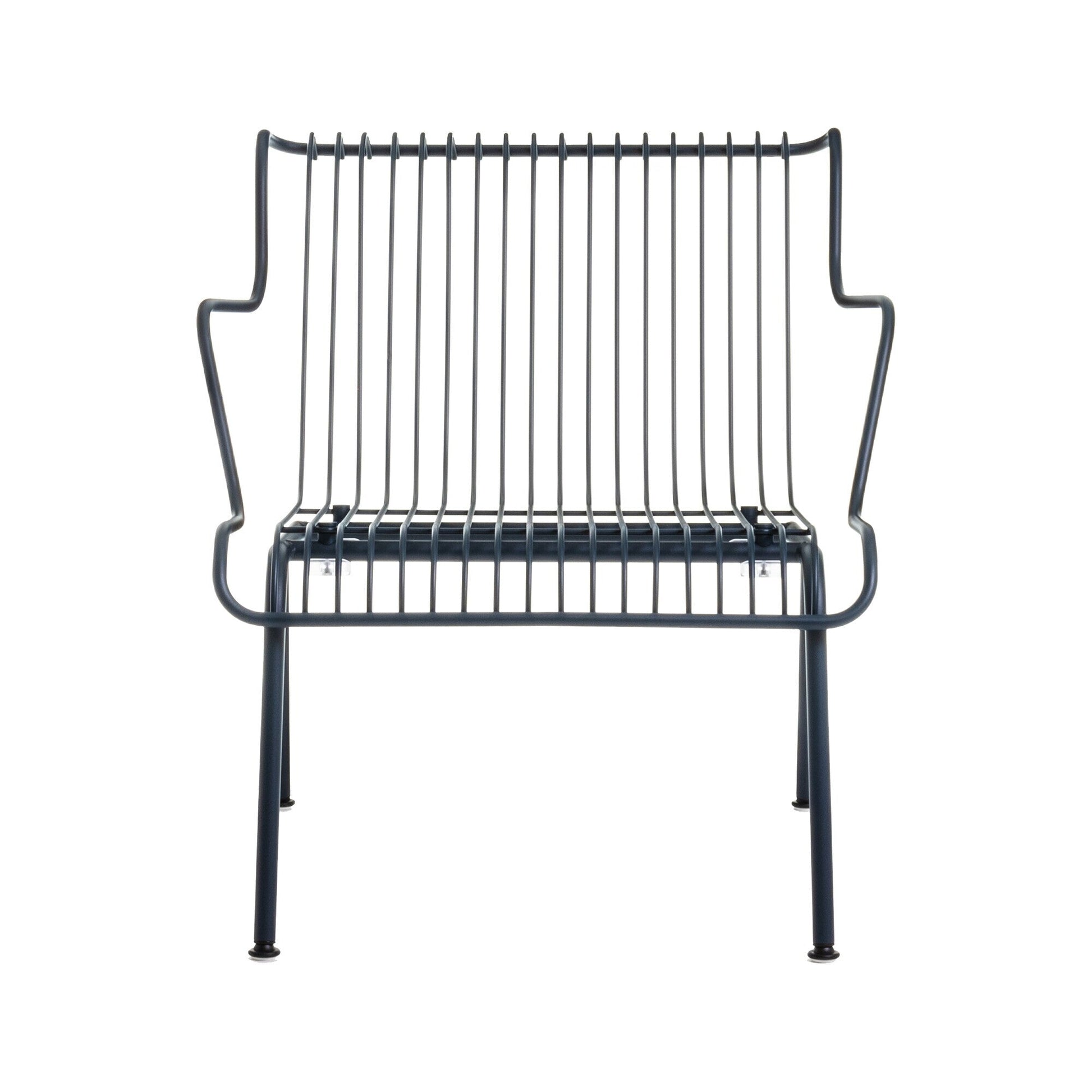 Die gitterartige Konstruktion des South Lounge Gartenarmlehnstuhls erzeugt eine dekorative Skulptur, die den Hintergrund durchschimmern lässt und einen attraktiven Schattenwurf erzeugt. Der geschwungene Rahmen, der sich sanft nach hinten neigt, garantiert einen gemütlichen Sitzkomfort, während die ausgestellten Beine einen stabilen Stand sicherstellen. Die parallel angeordneten Drahtstäbe, die sich in einem harmonischen Schwung von der vorderen Stuhlkante bis zum oberen Ende der Lehne ziehen, deuten auf eine großzügige Sitzfläche hin.