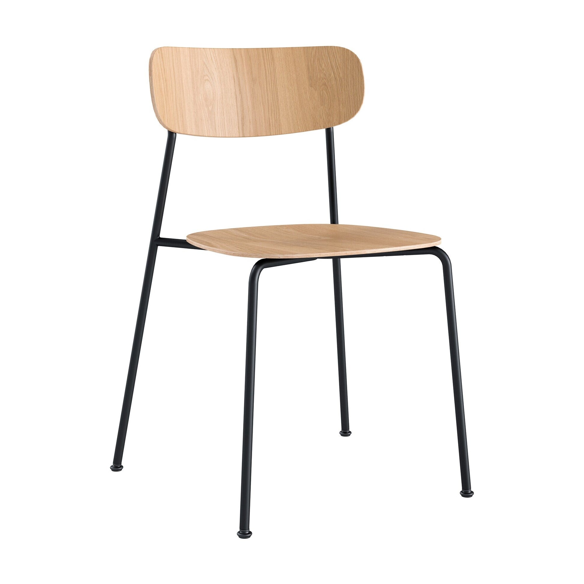 Der Scope Stuhl wurde speziell für vielseitige Anwendungsbereiche entwickelt, von der Küche bis zum Esszimmer. Die geschwungene Lehne und die Sitzfläche sind aus FSC-zertifiziertem Eichenfurnier in einer außergewöhnlichen Stärke von nur 7mm gearbeitet, was eine ressourceneffiziente Herstellung ermöglicht. Die abgerundeten Ecken der Holzflächen ergänzen den geradlinigen Stil des Stuhls harmonisch mit weichen Akzenten.