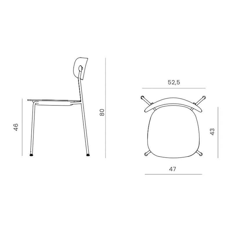 Ein Vierfußgestell mit leicht ausgestellten Beinen aus filigranem Stahlrohr mit 16mm Durchmesser trägt die Sitzfläche. Hier kommt 50% recycelter Stahl zur Anwendung. Die Hinterbeine gehen direkt in die Stützen der Rückenlehne über, was die Stabilität des Stuhls erhöht. Die runden Befestigungspunkte des Stahlrohrs an der Rückenlehne, die aus pulverbeschichtetem Zink bestehen, bilden schöne Akzente.