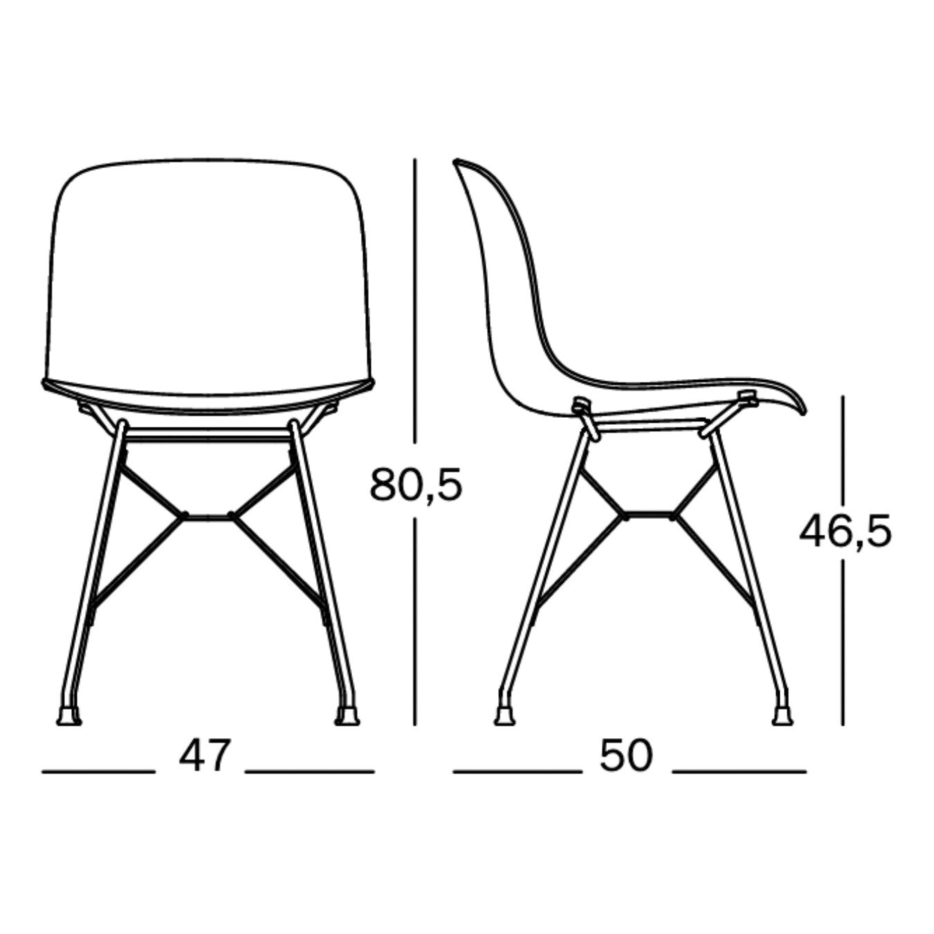 Der Troy Stuhl Gestell Stahldraht ist 47 cm breit, 80,5 cm hoch und 50 cm tief. Mit einer Sitzhöhe von 46,5 cm kann er mit jedem Tisch kombiniert werden. Der Stuhl ist ein perfektes Beispiel für zeitloses Design und exzellente Verarbeitung.