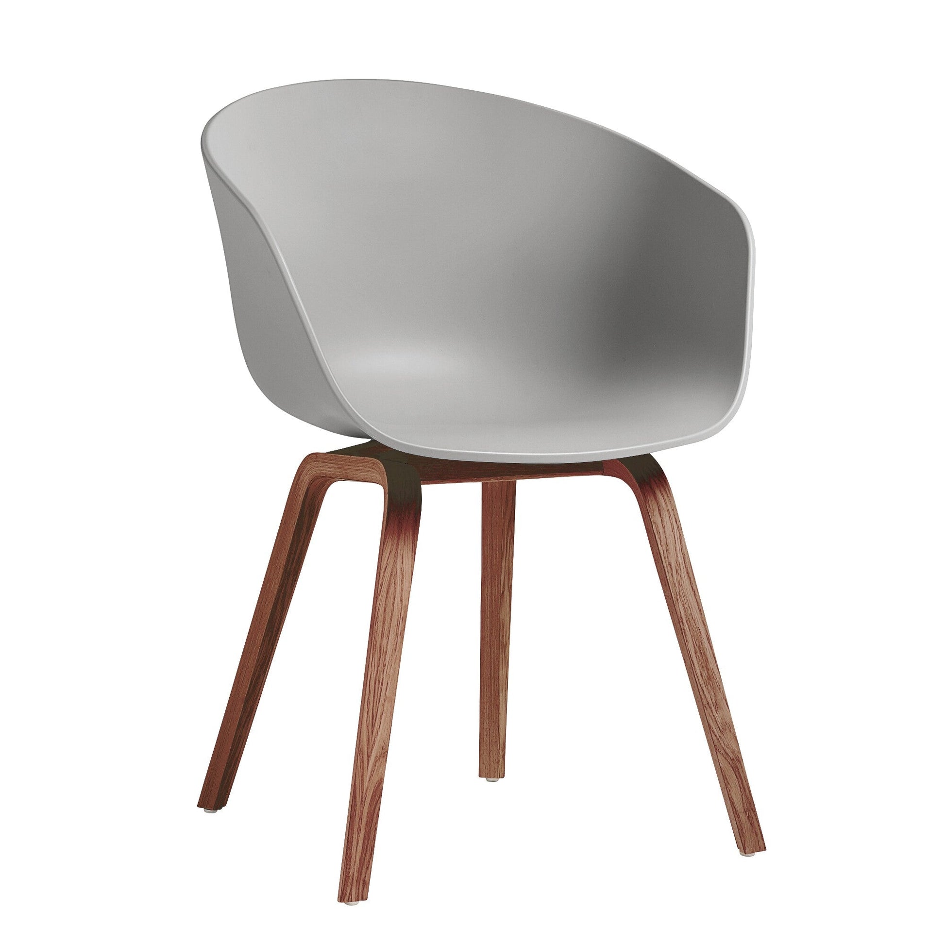 Ausführungen: About a Chair AAC 22 2.0 Armlehnstuhl Nussbaum / betongrau/Sitzschale Polypropylen recycelt/Gestell Nussbaum wasserbasiert lackiert/mit Kunststoffgleitern