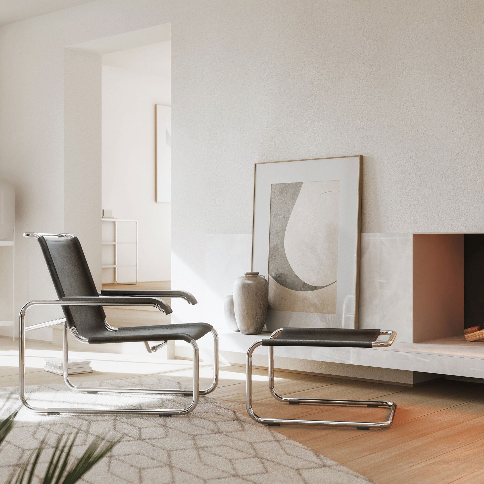 Material: Gestell: Stahlrohr, verchromt; Garnitur: Kernleder schwarz