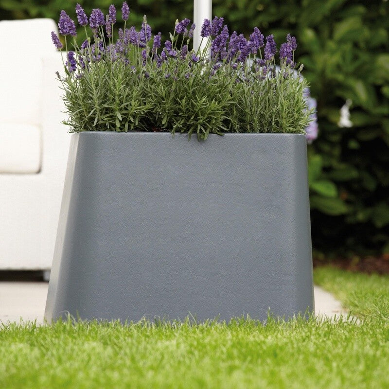 Der Fill Up Schirmständer aus widerstandsfähigem Polyethylen bietet ein Fassungsvermögen von 50 Litern und garantiert absolute Standfestigkeit, wenn er voll befüllt ist. Die Ablauflöcher im Boden sorgen für die perfekte Drainage der Blumenerde. Der Schirmständer ist ideal für jeden Sonnenschirm mit einem Stockmaß zwischen Ø25 bis 43 mm und kann mit einer gewöhnlichen Klemmschraube einfach montiert werden.