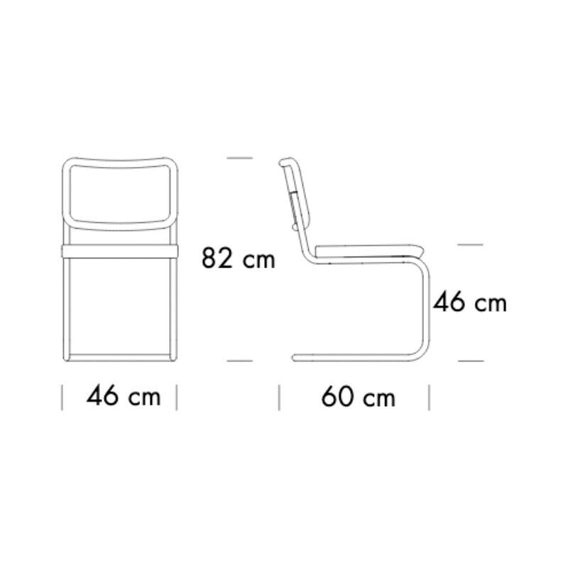 Mit seinen beeindruckenden Abmessungen von 60 cm Tiefe und 46 cm Breite sowie einer Höhe von 82 cm (Rückenlehne) und 46 cm (Sitzhöhe) ist der S 32 SPV Freischwinger gepolstert ein echter Höhepunkt in jedem Raum. Das Gestell mit einem Durchmesser von 2,5 cm trägt die weich gepolsterte Sitzfläche, die sich auf robustes Formsperrholz stützt. Ein echtes Meisterwerk der Möbelkunst, das jeden Raum mit Eleganz und Exklusivität füllt.