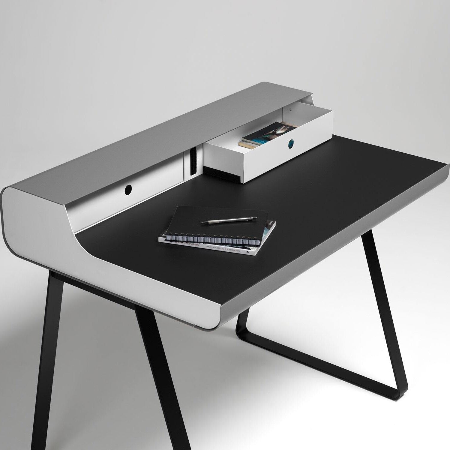 Ausführungen: PS10 Sekretär / telegrau RAL7046/signalweiß RAL9003/seidenmatt/Arbeitsfläche Linoleum/Gestell schwarz matt RAL9005