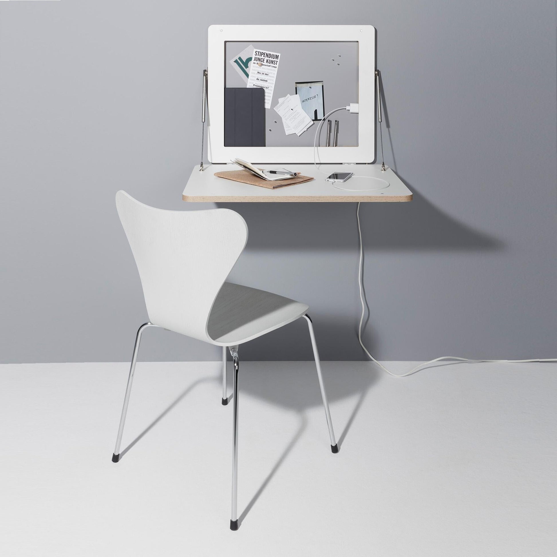 Der Flatframe Wandsekretär erfüllt alle Anforderungen eines modernen Arbeitsplatzes: Die Arbeitsfläche kann hochgeklappt werden, um das Minibüro zu verschwinden lassen. Zusammengeklappt ist der Tisch nur 5 cm tief. Der Sekretär kann je nach Montagehöhe sowohl im Sitzen als auch im Stehen verwendet werden. Die magnetische Rückwand dient als Memoboard für Notizen und kann individuell mit Fotos gestaltet werden. Der Rahmen der Rückwand beherbergt vier Steckdosen.