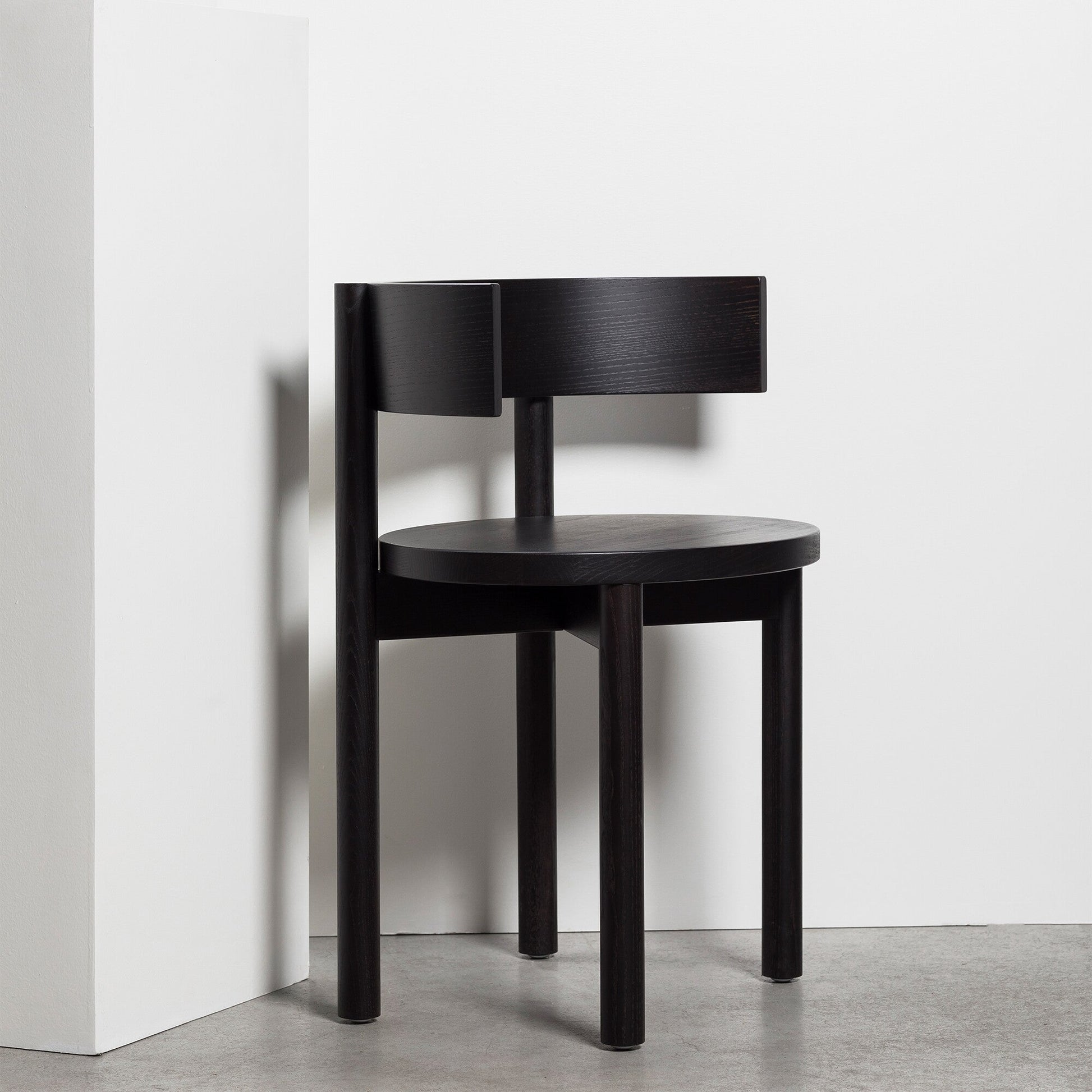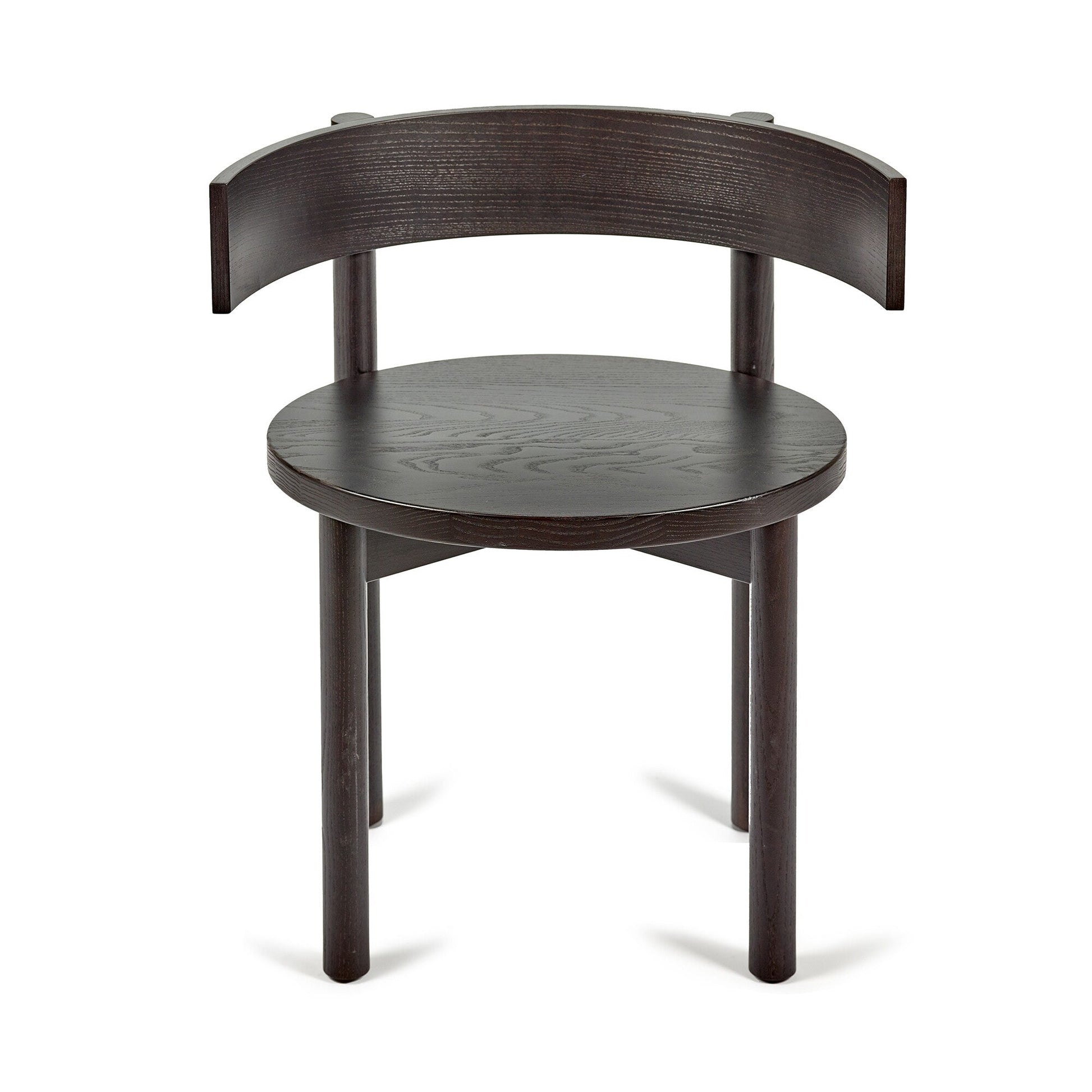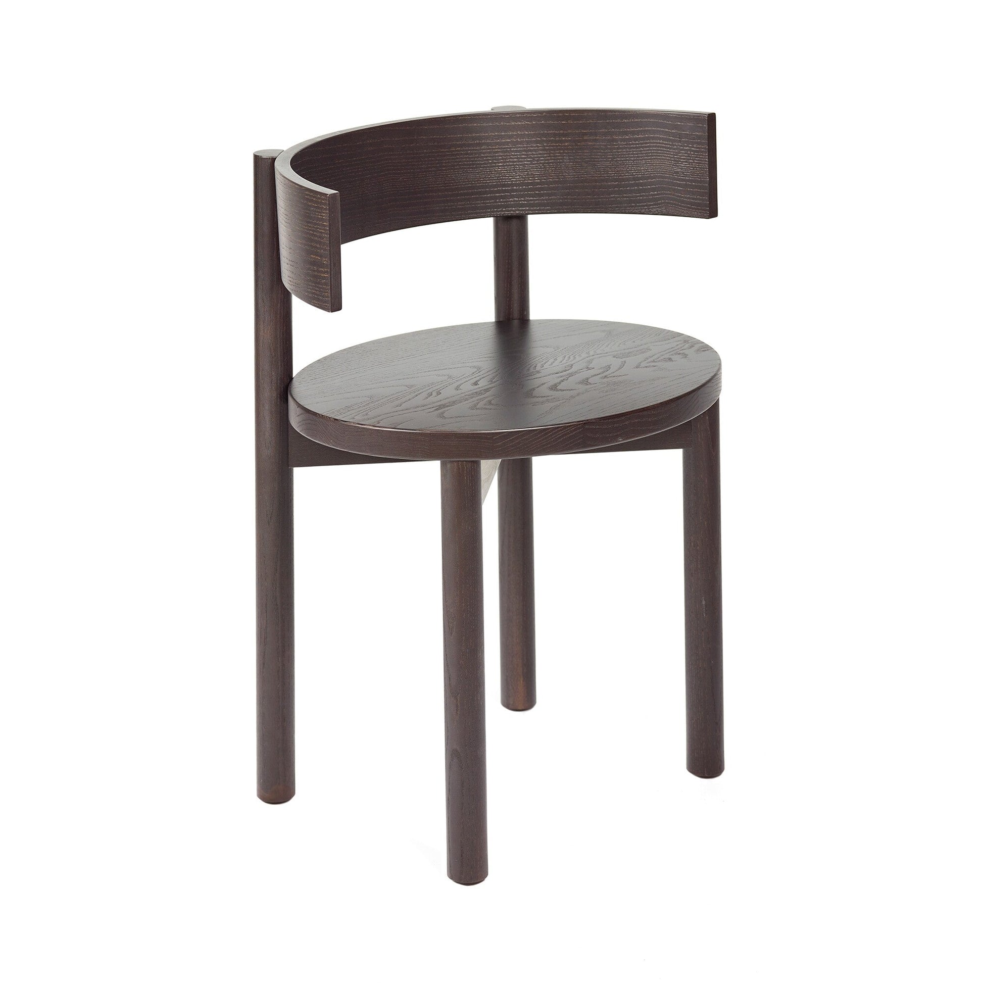 Einzigartig ist die formschöne Ellipse des Sitzes, die von einer geraden Oberfläche und einer breiten Kante geprägt ist. Diese harmonisch gestaltete Form findet in der breiten, elliptisch gebogenen Lehne ein Pendant, das nicht nur als Stütze für den Rücken dient, sondern auch als Auflage für die Arme. Die geraden Rundstützen, die die rückwärtigen Stuhlbeine verlängern, verleihen dem Stuhl ein stabiles Gerüst, das durch verkreuzte Auflager verstärkt wird.