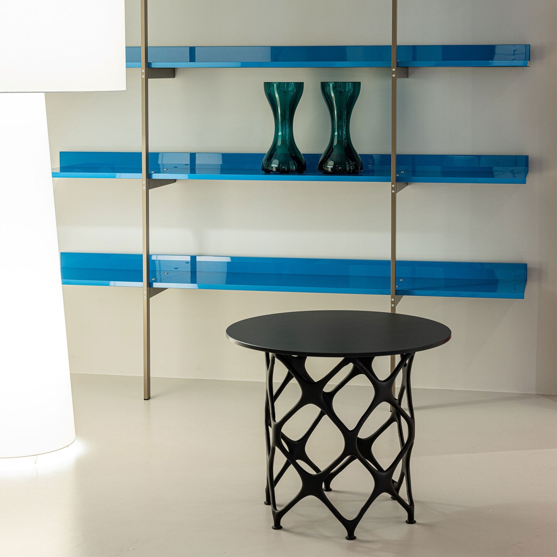 Der runde Sockel des Tisches ist der eigentliche Blickfang, mit einer Gitterstruktur, die sich in leicht wellenartigen Formen windet. Diese Basis besteht aus einem innovativen Materialmix aus spritzgegossenem Kunststoff und Glasfaser, der 40% neues Nylon, 30% recyceltes Nylon und 30% Glasfaser enthält. Sechs kleine Standfüße an der Basis sind mit bodenschützenden und rutschhemmenden Kunststoffkappen ausgestattet, die die runde Tischplatte aus Hochdrucklaminat tragen.