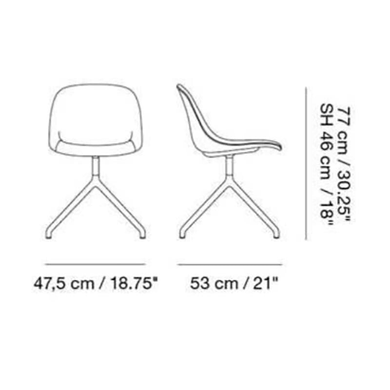 Der Fiber Side Chair Drehstuhl gepolstert von Muuto zeichnet sich durch seinen modernen Standfuß aus, der in einem vierbeinigen Abschluss endet. Dieser Industrial-Style ist nicht nur aktuell, sondern auch ein Statement in Sachen Design. Mit seinen Maßen von 47,5 x 77 x 53 cm passt sich der Stuhl gut ins Raumgefüge ein und eignet sich sowohl als Lounge-Sessel als auch zur Verwendung im Esszimmer. Eine Variante mit Armlehnen ist ebenfalls erhältlich.