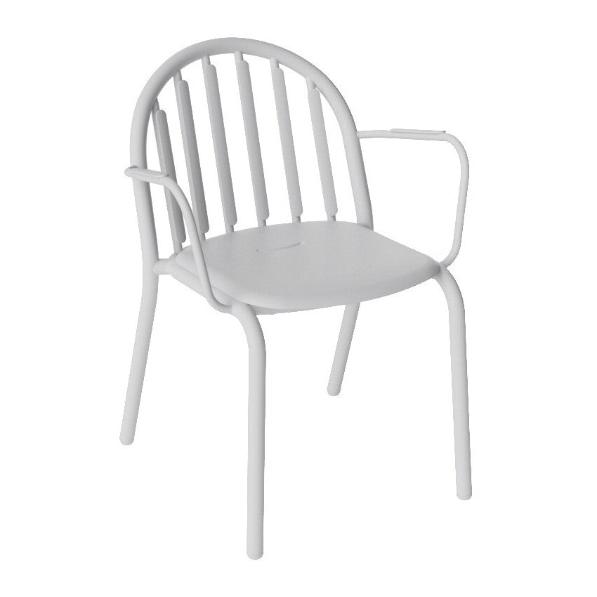 Der Armlehnstuhl ist Teil der Fred's-Kollektion, die auch einen designgleichen Stuhl ohne Armlehnen und Gartentische in verschiedenen Farben umfasst. Bis zu sechs Stühle sind platzsparend stapelbar, was sie zu einem idealen Ausgangspunkt für Ihre individuelle Sitzgruppe macht.