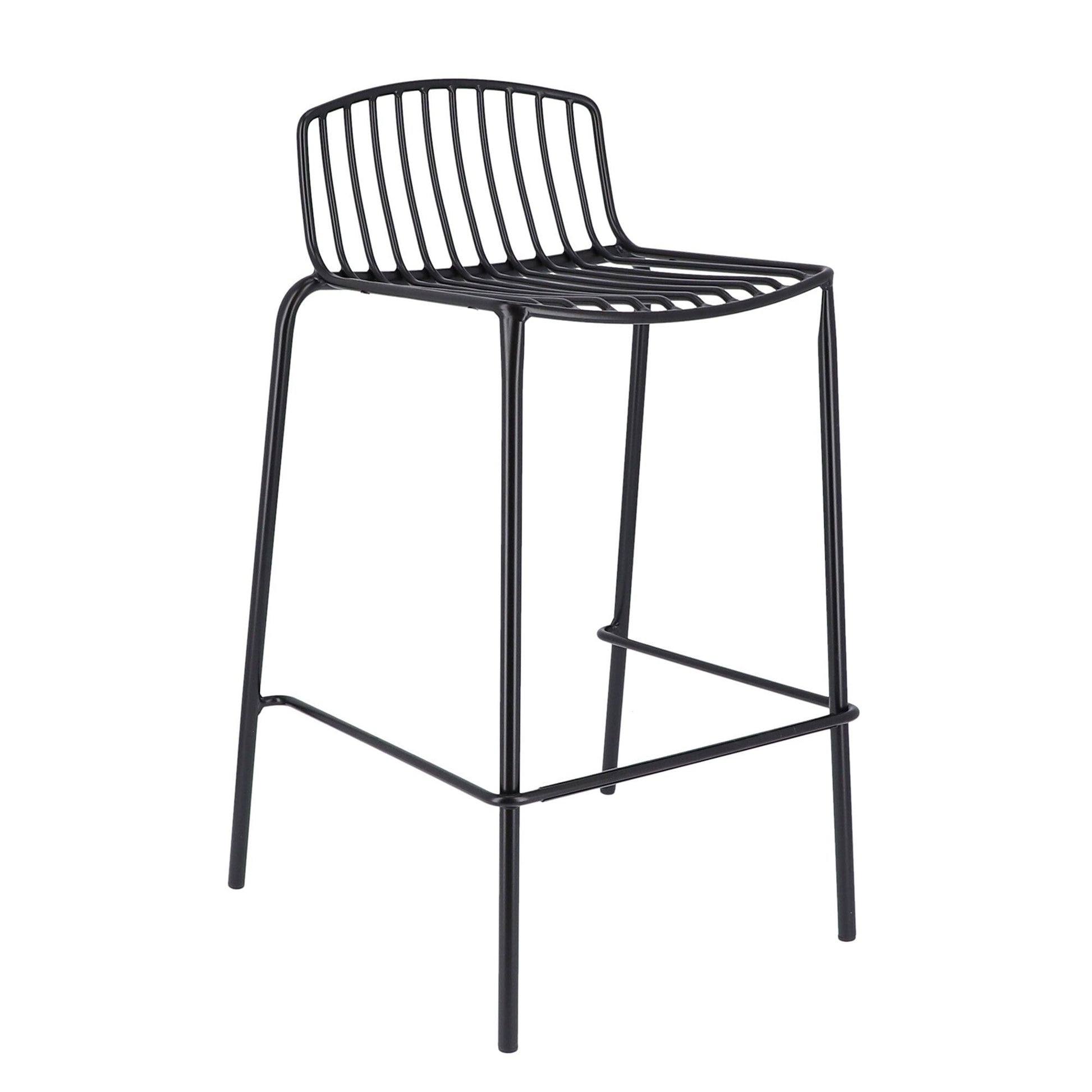 Das Design des Mori Gartenbarstuhls wird durch schmale, fortlaufende Verstrebungen an der leicht konkaven Sitzfläche und der kurzen, oben abgerundeten Rückenlehne geprägt. Das schlankes Gestell mit vier Beinen und schmalen Fußstützen sorgt für Komfort und Stabilität, während das bis 4 Stück stapelbare Modell aus pulverbeschichtetem Stahl hergestellt ist, der wetterbeständig den Elementen im Freien trotzt.