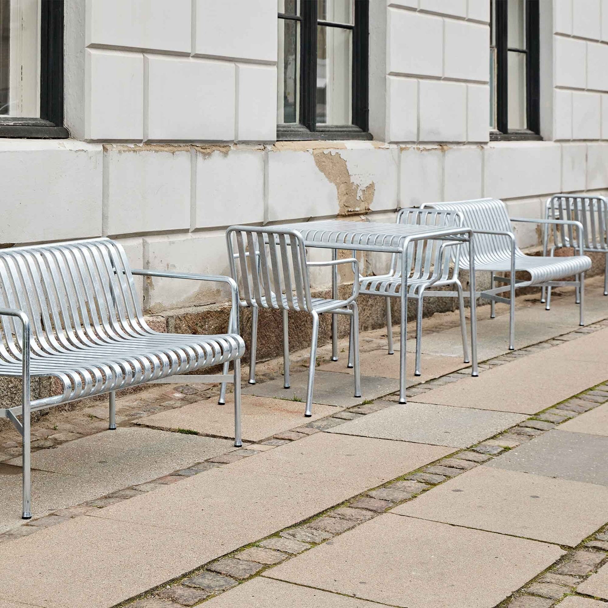 Mit einer Höhe von 75 cm bietet sich der Palissade Gartentisch perfekt zu den gemütlichen Sitzgelegenheiten der Serie an. So entsteht ein ansprechendes Ensemble, das auf der Terrasse oder am Balkon zum Hingucker wird. Ideal geeignet ist der Palissade Gartentisch auch für Cafés und Bistros. Dank dem wetterbeständigen Stahl kann das Modell auch bei Regen im Freien bleiben.