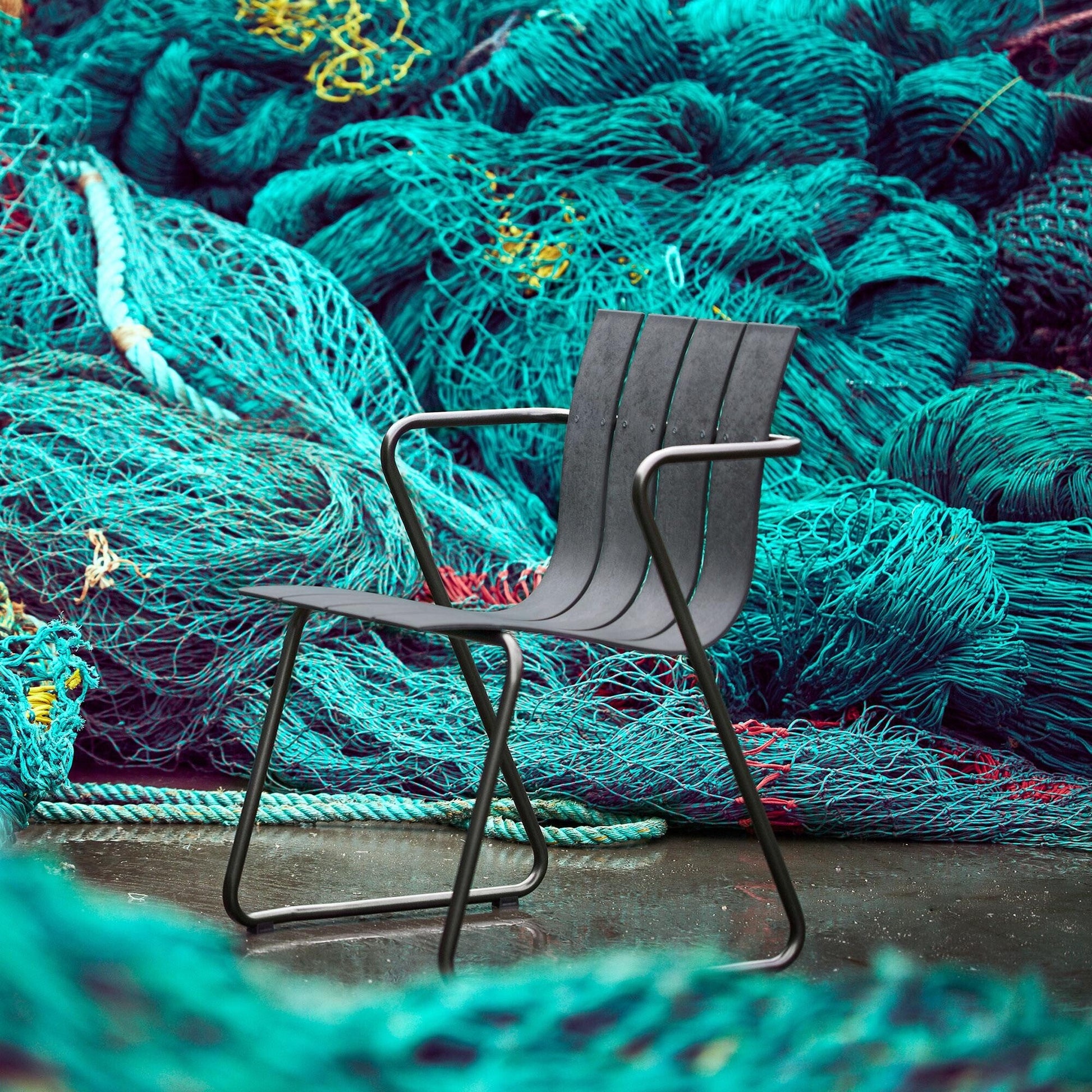 Das Material, das den eleganten Bezug des Stuhls bildet, stammt aus recyceltem Hartplastik und Fischernetzen. Diese ungewöhnliche Herkunft ist nicht nur ein Zeichen für die Verantwortung gegenüber der Umwelt, sondern auch ein Ausdruck der kreativen Freiheit, die Mater in seine Produkte einfließt. Die Verarbeitung ist von höchster Qualität, was den Ocean Armlehnstuhl zu einem langlebigen und eleganten Begleiter macht, der sein Design auch mit der Zeit nicht verliert.