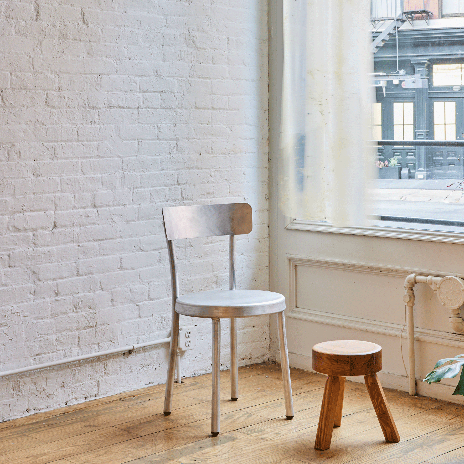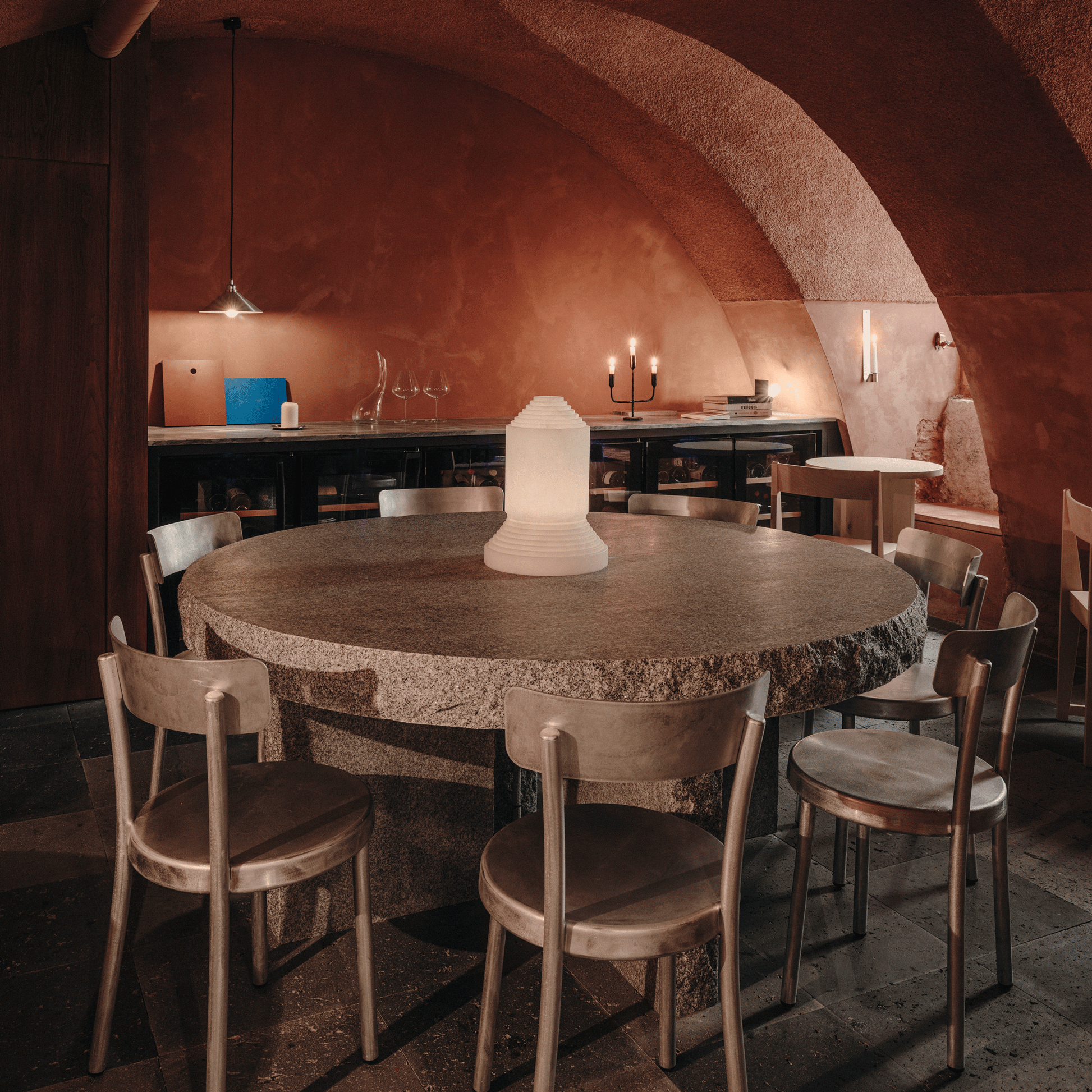 Der Tasca Stuhl selbst ist ein perfektionierter Lehnstuhl, der durch seine kreisrunde Sitzfläche, seine breite, stark eingebuchte Rückenlehne und seine sanft gebogenen Stuhlbeine mit runden Querschnitt einen bequemen und robusten Eindruck erweckt. Die matt glänzende Patina wirkt, als wäre er aus Holz gefertigt und über lange Zeit beansprucht worden. Tatsächlich besteht der Tasca Stuhl jedoch aus hochwertigem Aluminium, was ihn besonders leicht macht und ermöglicht, ihn einfach an den gewünschten Ort zu bringen.