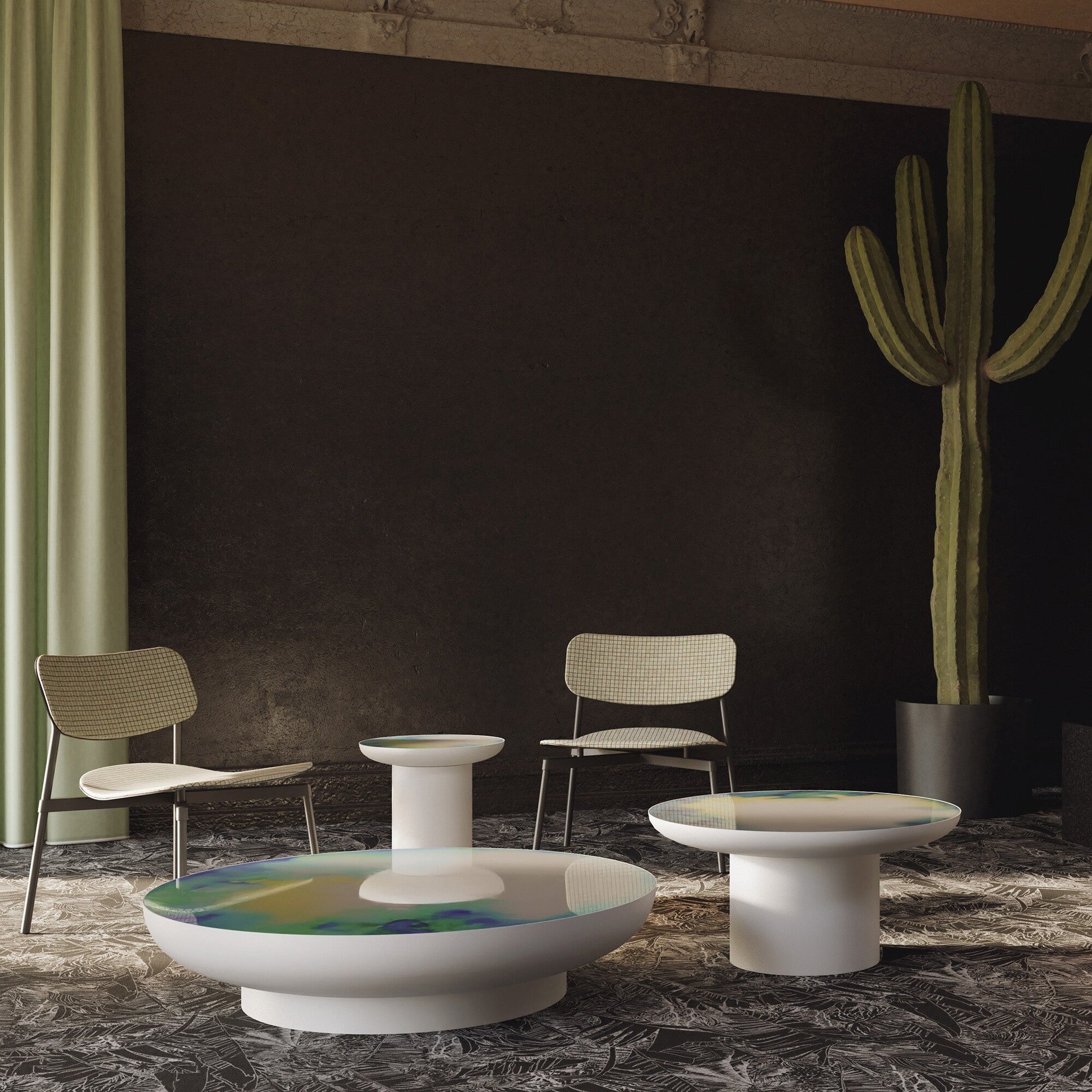 Ausführungen: Francis Tall Mirror Beistelltisch / blau/gelb/Aquarell/Spiegelglas gehärtet laminiert/H 45cm/Ø 40cm/Gestell Stahl gekörnt weiß epoxylackiert