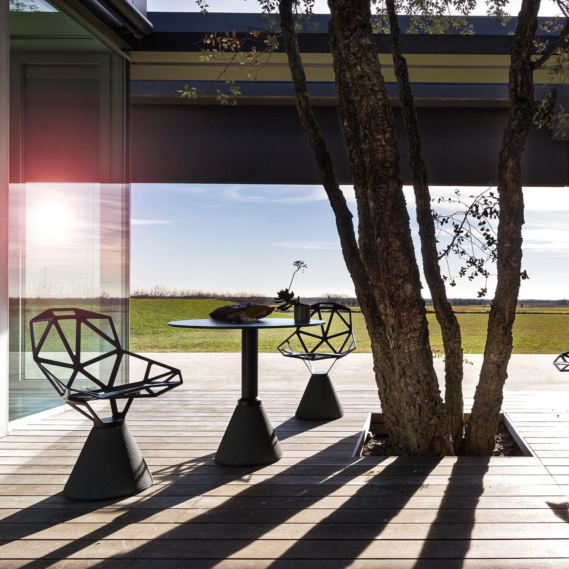 Ein interessanter Kontrast zu dem nüchternen Baumaterial bildet die Sitzschale aus Aluminium, die in einem speziellen Druckgussverfahren geformt wird. Die Sitzschale besteht aus geraden Streben, die ein geometrisches Muster bilden, das fast an einen Fußball erinnert. Der feuerbeständige Chair One Stuhl Zementfuß kann auch für den Außenbereich verwendet werden.