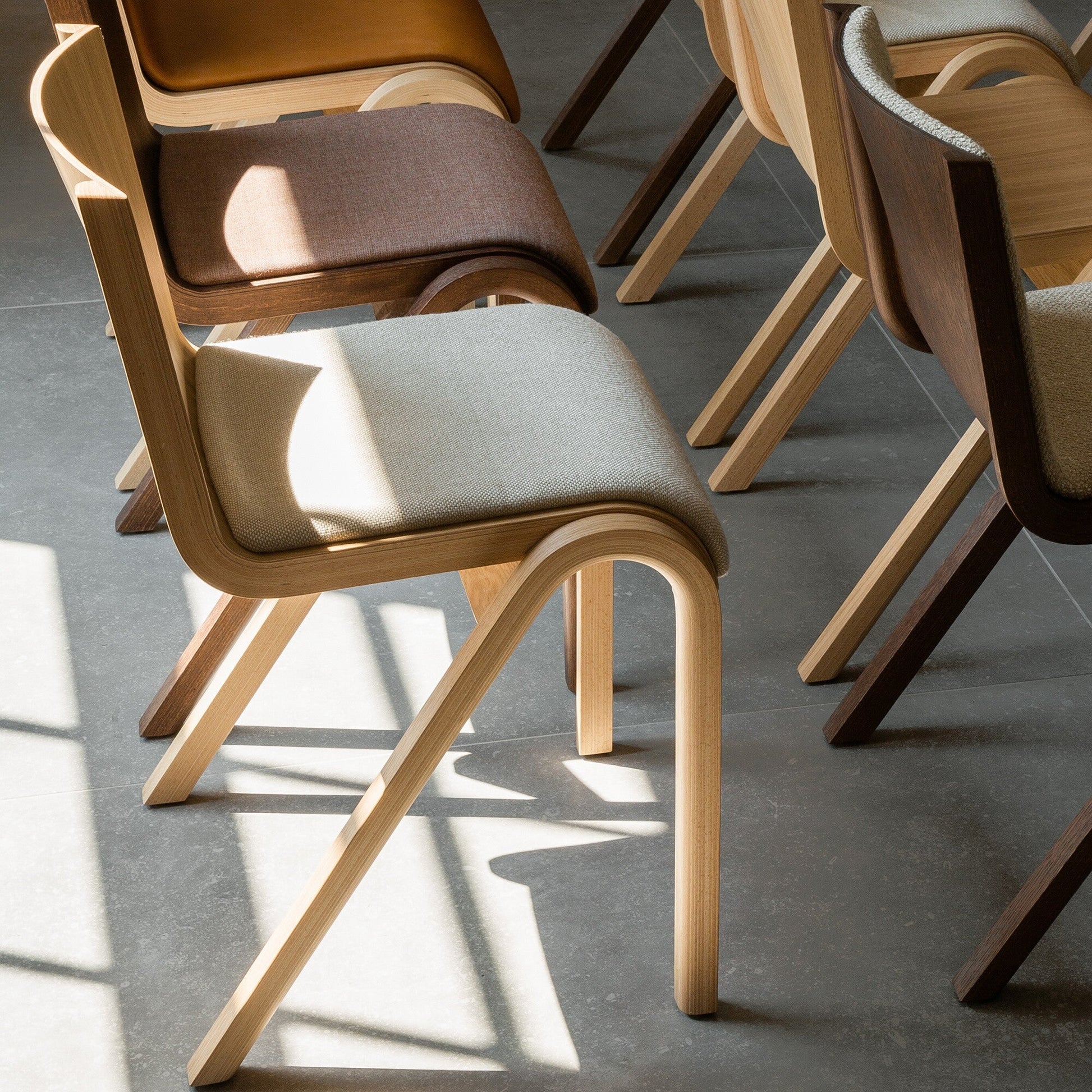Der Ready Stuhl Sitz gepolstert ist aus hochwertigem Eichenholz und Eichenfunier gefertigt, was nicht nur seine Dauerhaftigkeit, sondern auch seine einzigartige Ästhetik unterstreicht. Die fließenden Kurven des Stuhls, die sich in der Form der Rückenlehne und der Rundung am Ende der Sitzfläche widerspiegeln, bieten einen perfekten Sitzkomfort. Die Polsterung aus Schaumstoff, die sich über die gesamte Sitzfläche erstreckt, sorgt für maximale Komfort, selbst bei langem Sitzen. Die Sitzfläche ist mit edlem Stoff bezogen, während die Stuhlbeine nach hinten schräg zulaufen und auf Höhe der Sitzfläche einen eleganten Bogen bilden.