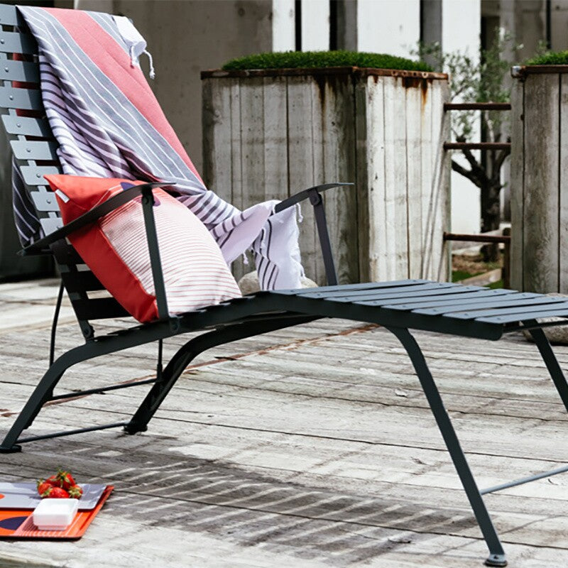 Der Bistro Liegestuhl zeichnet sich durch seine einzigartige Konstruktion aus: locker aneinandergereihte Latten aus pulverlackiertem Stahl schaffen einen attraktiven Blickfang, während die sanft gewölbten Stahlbleche eine bequeme Liegefläche bieten, die zum Nickerchen einlädt. Die 3-stufig verstellbare Rückenlehne ermöglicht es, den Liegestuhl auch zum Lesen oder zum Genuss eines Getränks zu nutzen. Der Stahlrahmen mit weit ausgestellten Beinen garantiert eine hohe Stabilität und das witterungsbeständige Material macht ihn ideal für den Einsatz unter freiem Himmel.