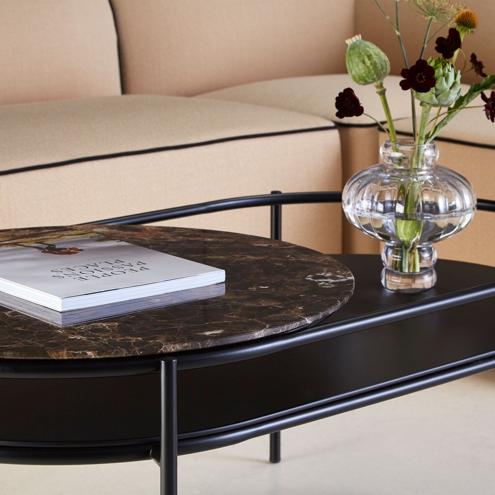 Die untere Tischplatte ist aus Eichenfurnier gefertigt und schwarz lackiert, was sie äußerst pflegeleicht macht und ermöglicht, sie einfach abzuwischen. Ein interessanter Kontrast dazu bildet die darüber befestigte runde Tischplatte aus Marmor, das traditionelle Material weist individuelle Maserungen auf. Jeder Verde Couchtisch ist daher ein einzigartiges Stück.