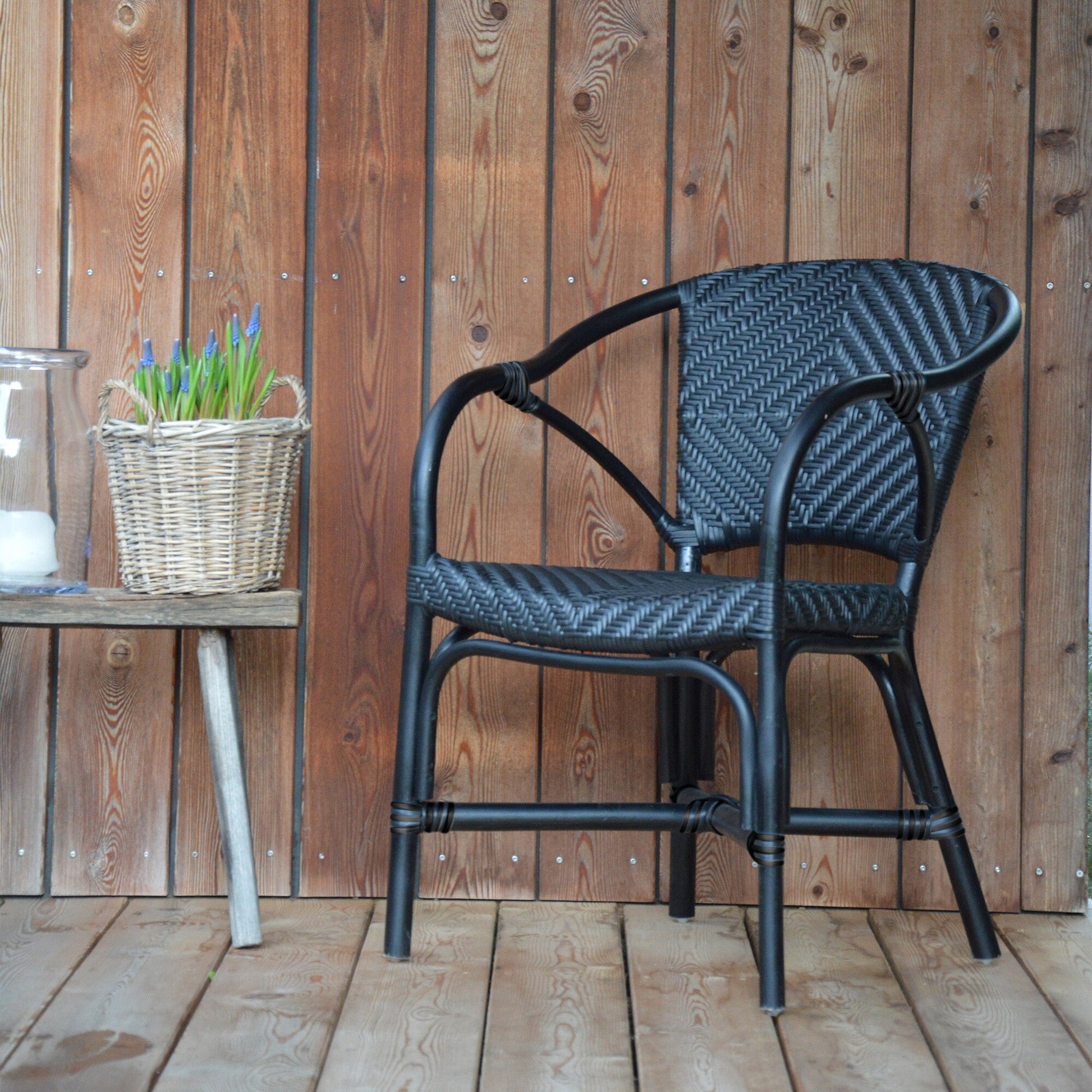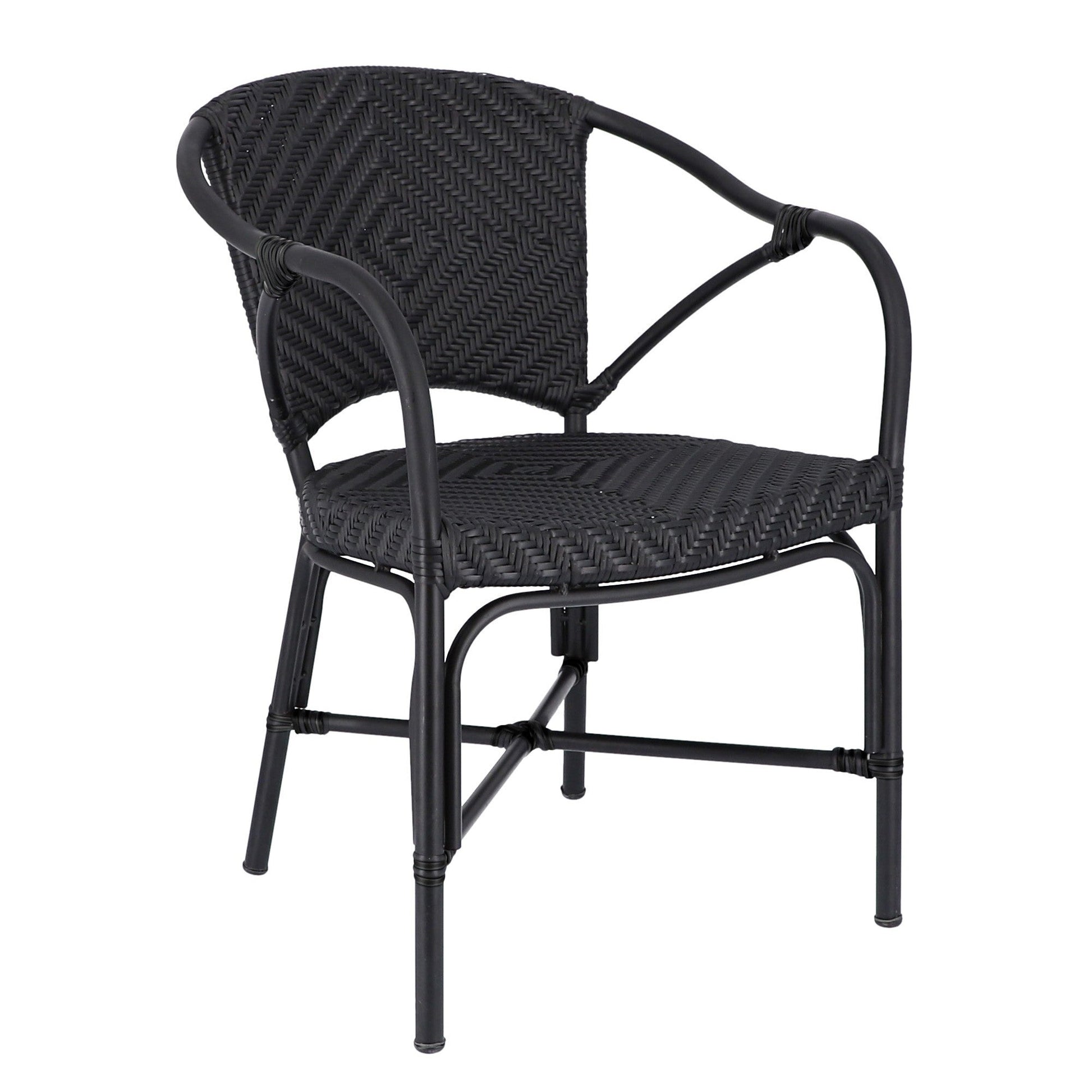 Die Rückenlehne und die Sitzfläche sind aus einem Kunststoffgeflecht hergestellt, das einzigartige Muster verleiht dem Noir Armlehnstuhl ein elegantes Erscheinungsbild. Durch die einrahmende Form der Rückenlehne und des Gestells bietet der Stuhl ein außergewöhnliches Sitzgefühl, auch bei längerem Verweilen.
