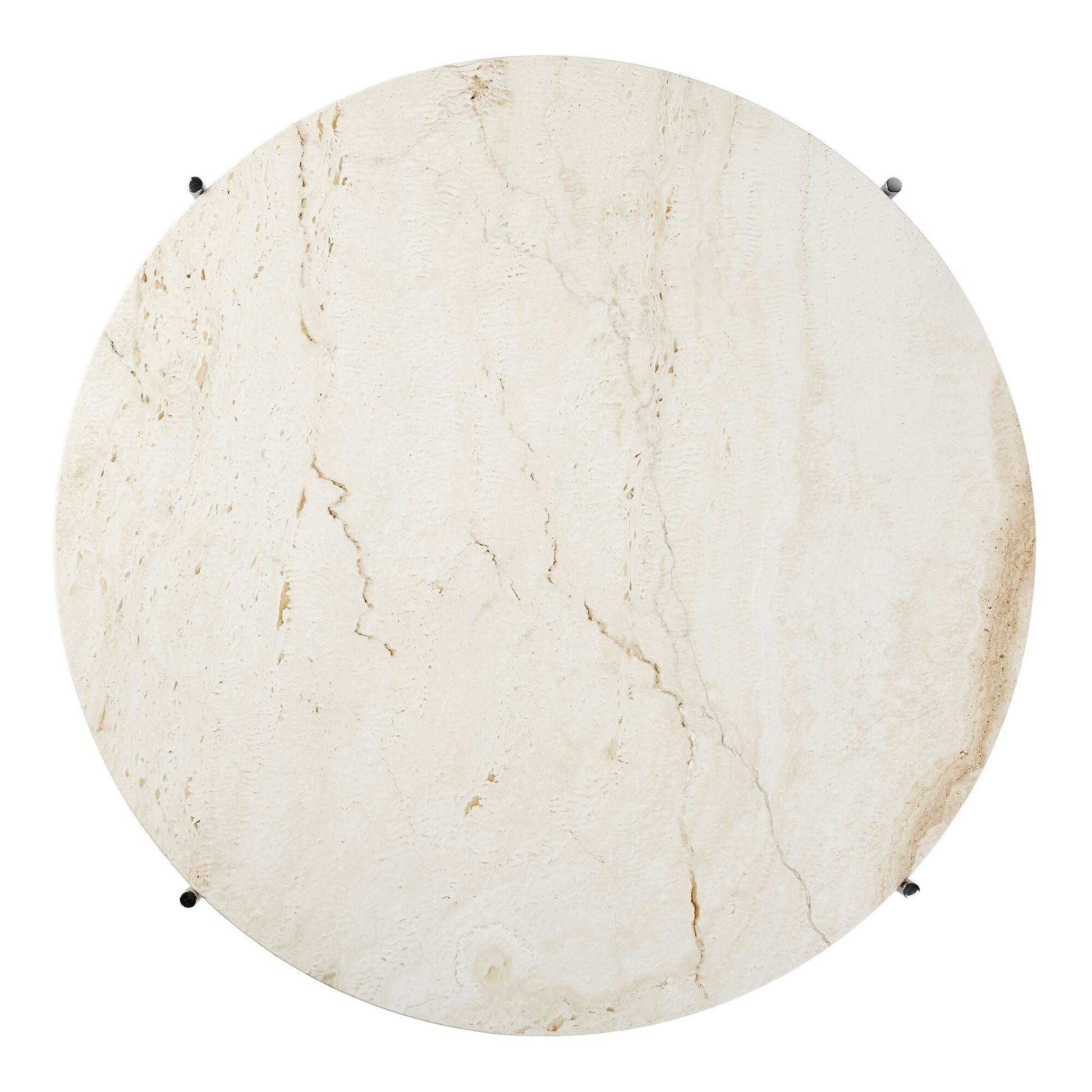 Die runde Travertin- oder Marmorplatte wirkt schwer, aber dank ihrer sanft geschwungenen, unregelmäßigen Struktur verleiht sie dem TS Couchtisch Ø 80cm einen unvergleichlichen Charakter. Der Unterbau des Designtisches ist von rasterartig angeordneten, geraden Linien geprägt, während das Gestell aus zwei verkreuzten Stahlrohrrahmen besteht, deren Beine unter der Tischplatte hervorragen, um den Stein stabil zu verankern. Drei zierliche Rundstangen verstreben die Beine und bilden mittig unter der Steinplatte einen raffinierten Knotenpunkt, der für einen auffälligen Hingucker sorgt.