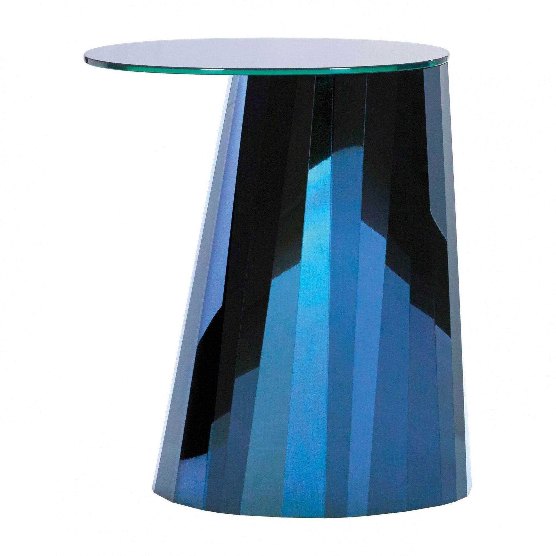 Ausführungen: Pli Beistelltisch hoch / saphir-blau/Kristallglas 53x42cm/H 65cm/Filzgleiter schwarz/Gestell Edelstahlblech glänzend Ø47cm