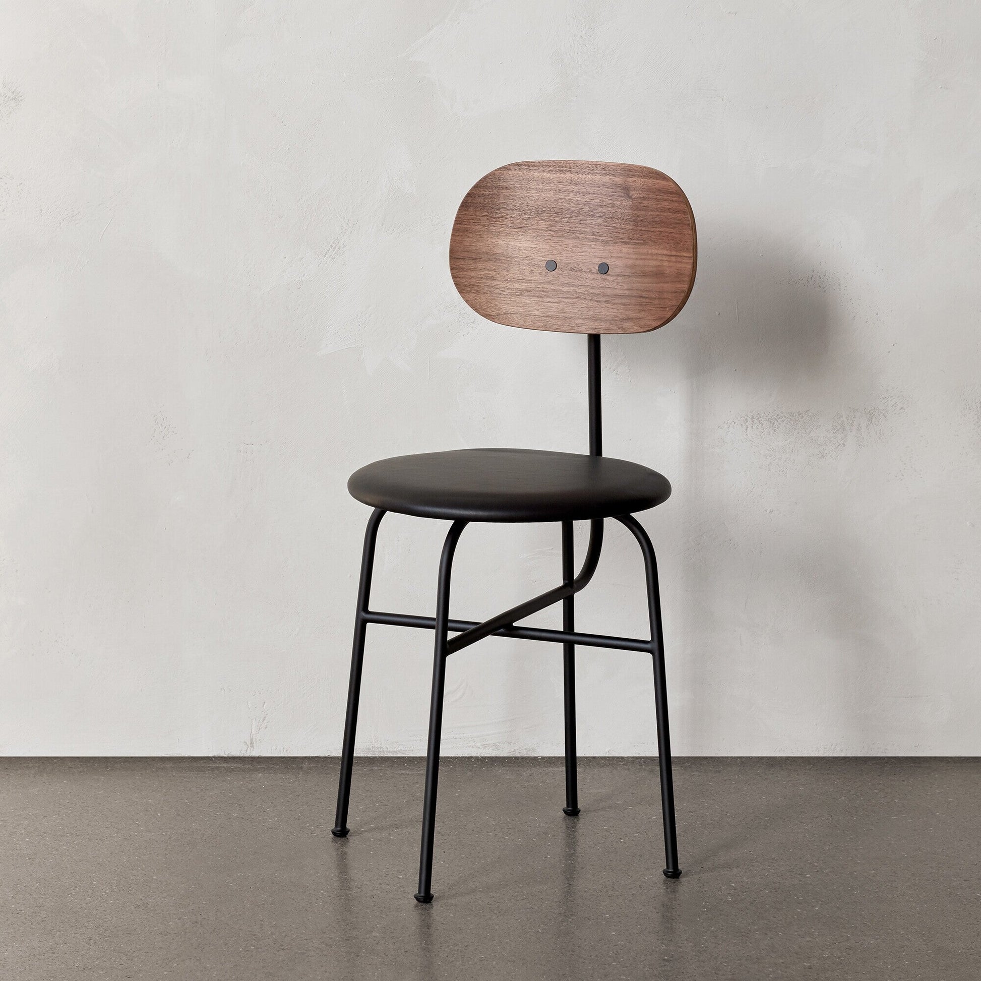 Die ovale Rückenlehne aus Eichenfurnier ist leicht gebogen und an einer verlängerten Strebe des Gestells festgemacht. Dies ist nicht nur optisch ein Highlight, sondern sorgt auch dafür, dass die Lendenwirbel auch bei längerem Sitzen optimal gestützt werden. Die gepolsterte Sitzfläche ist mit hochwertigem Leder bezogen, das nicht nur edel aussieht, sondern sich auch angenehm anfühlt und mit der Zeit eine charaktervolle Patina entwickelt. Mit einer Breite von 45,5 cm, einer Höhe von 81,5 cm und einer Tiefe von 51 cm bietet der Afteroom Plus Stuhl Leder eine ergonomische Sitzposition. Die Sitzhöhe beträgt 46 cm.