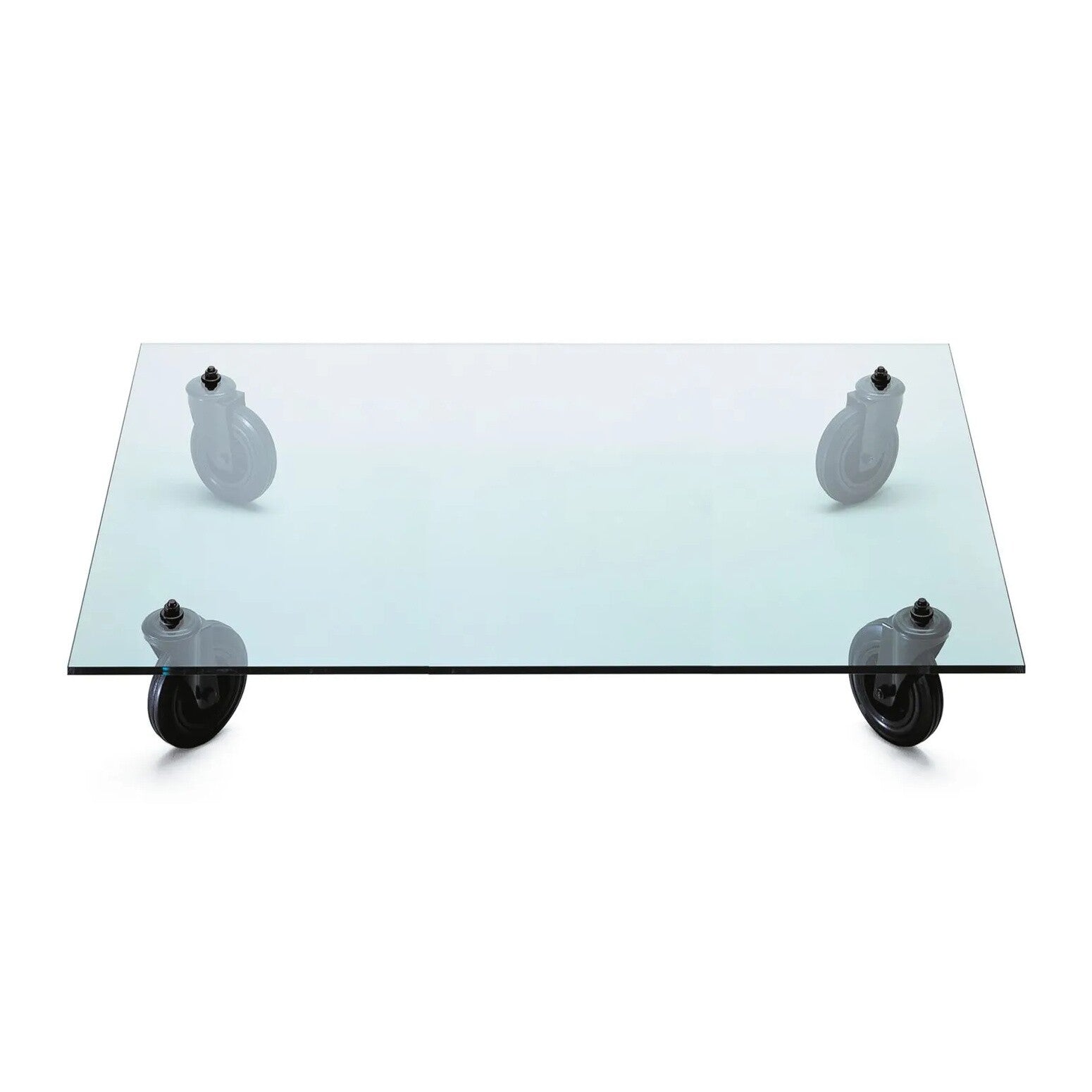 Das Designstück besteht aus edlem Glas, das mit hochwertig geschliffenen Kanten auffällt, und verleiht dem Tavolo Con Ruote Couchtisch 120x120cm einen eleganten Charakter, der sich perfekt in jedes moderne Wohninterieur einfügt. Die transparente Platte gibt nicht nur den Blick auf den Boden frei, sondern lässt auch die auffällig großen Industrieräder mit ihren schweren Gabeln aus Metall erkennen. So kann der Tavolo Con Ruote Couchtisch 120x120cm ganz im Sinne der originalen Bestimmung bewegt werden.