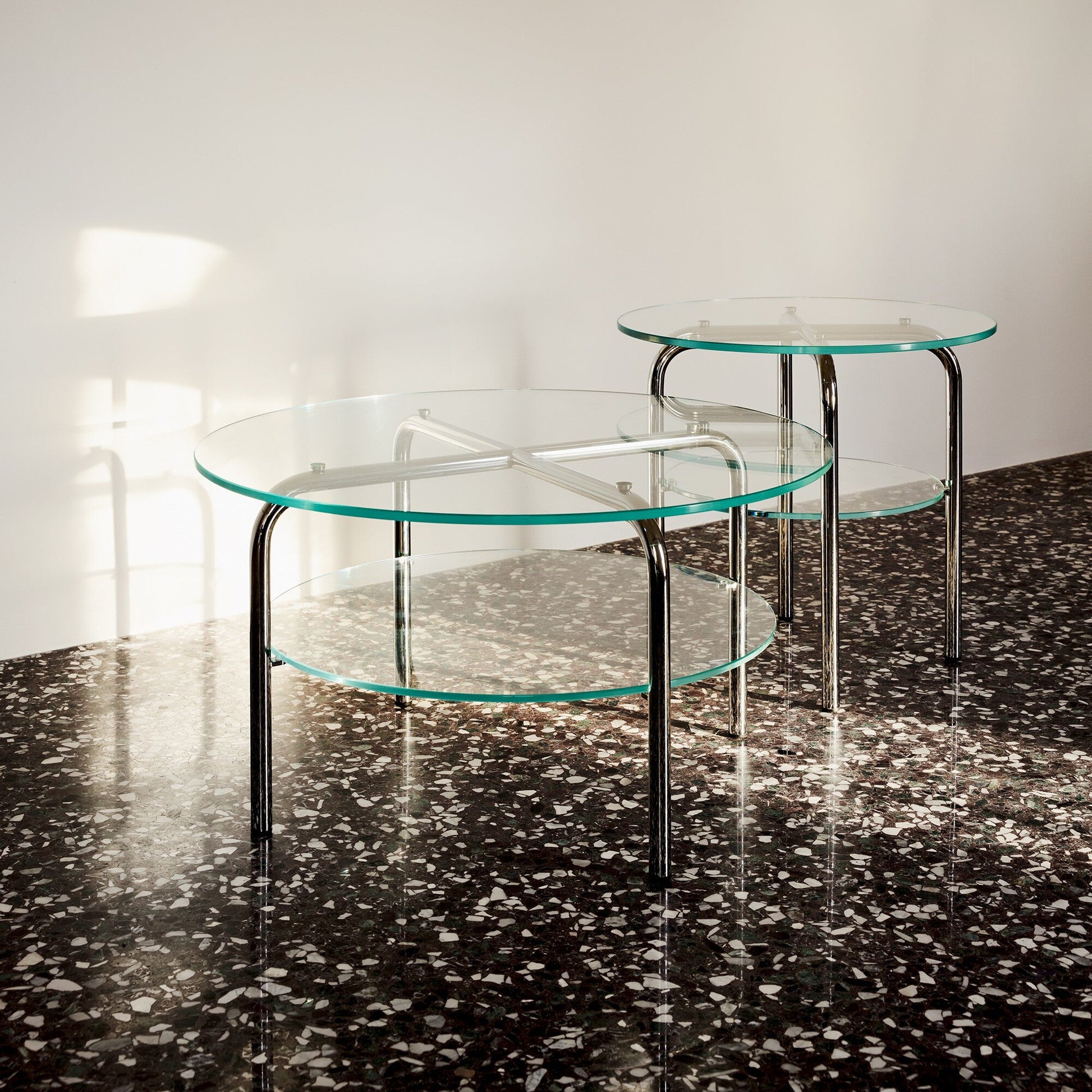 Ausführungen: MR 516 Beistelltisch / transparent/Klarglas/H 38cm/Ø 70cm/Kunststoffgleiter schwarz/Gestell Stahlrohr vechromt