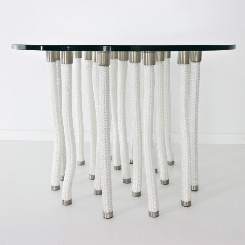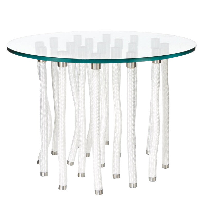 Die Struktur besteht aus einer Kombination von biegbaren Kordelbeinen aus Polypropylen und festen Beinen mit Innenkern aus Stahl, die die Tischplatte aus Glas tragen. Die Verbindungsteile zwischen Beinen und Platte sind aus satiniertem Edelstahl gefertigt. Diese Kombination aus Grazie und Robustheit ist einzigartig und unterstreicht die Exklusivität dieses Designstücks.