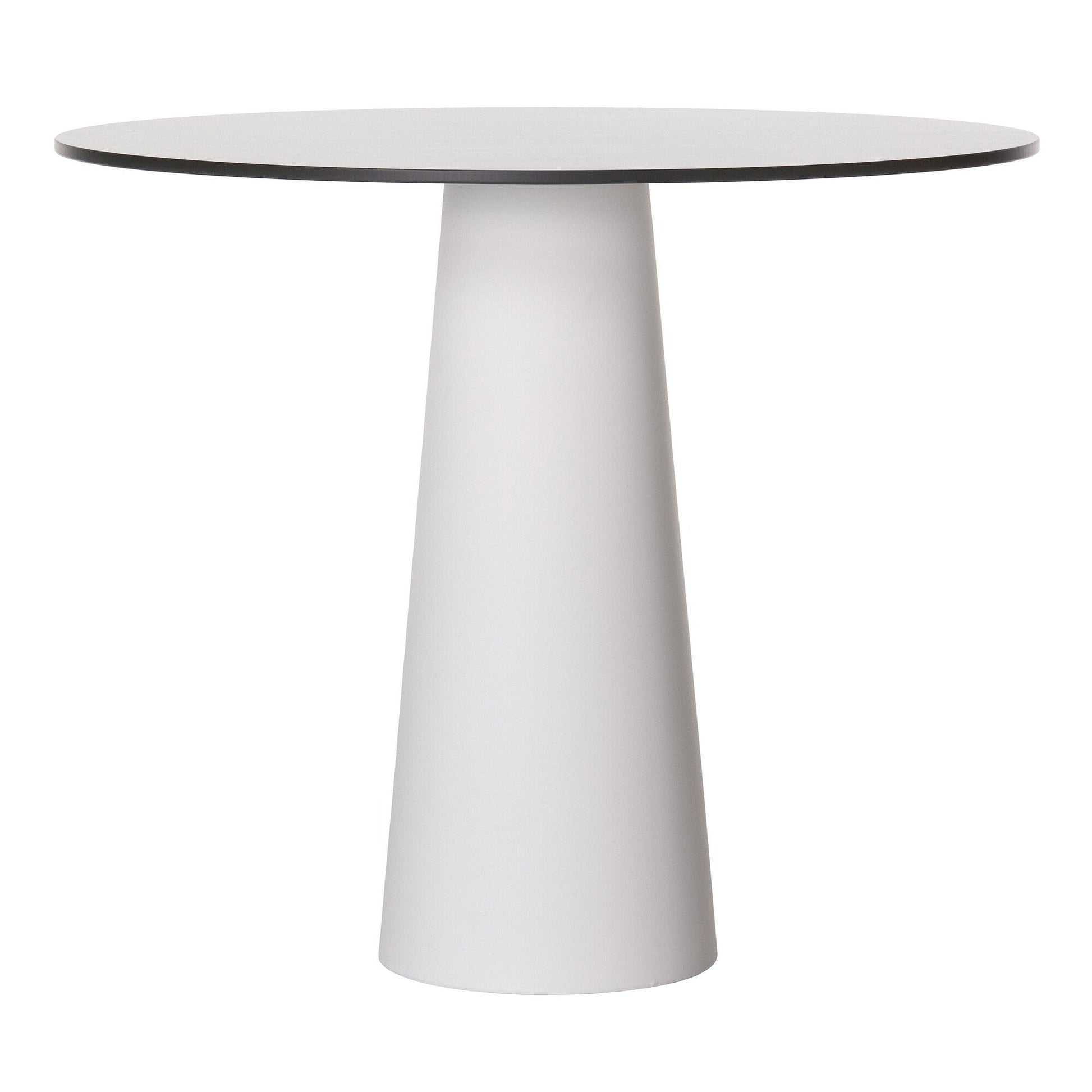 Ausführungen: Container Gartentisch Ø90cm / weiß/Laminat 1,2cm/Kante schwarz/Gestell weiß RAL 9016 H71cm x Ø30cm