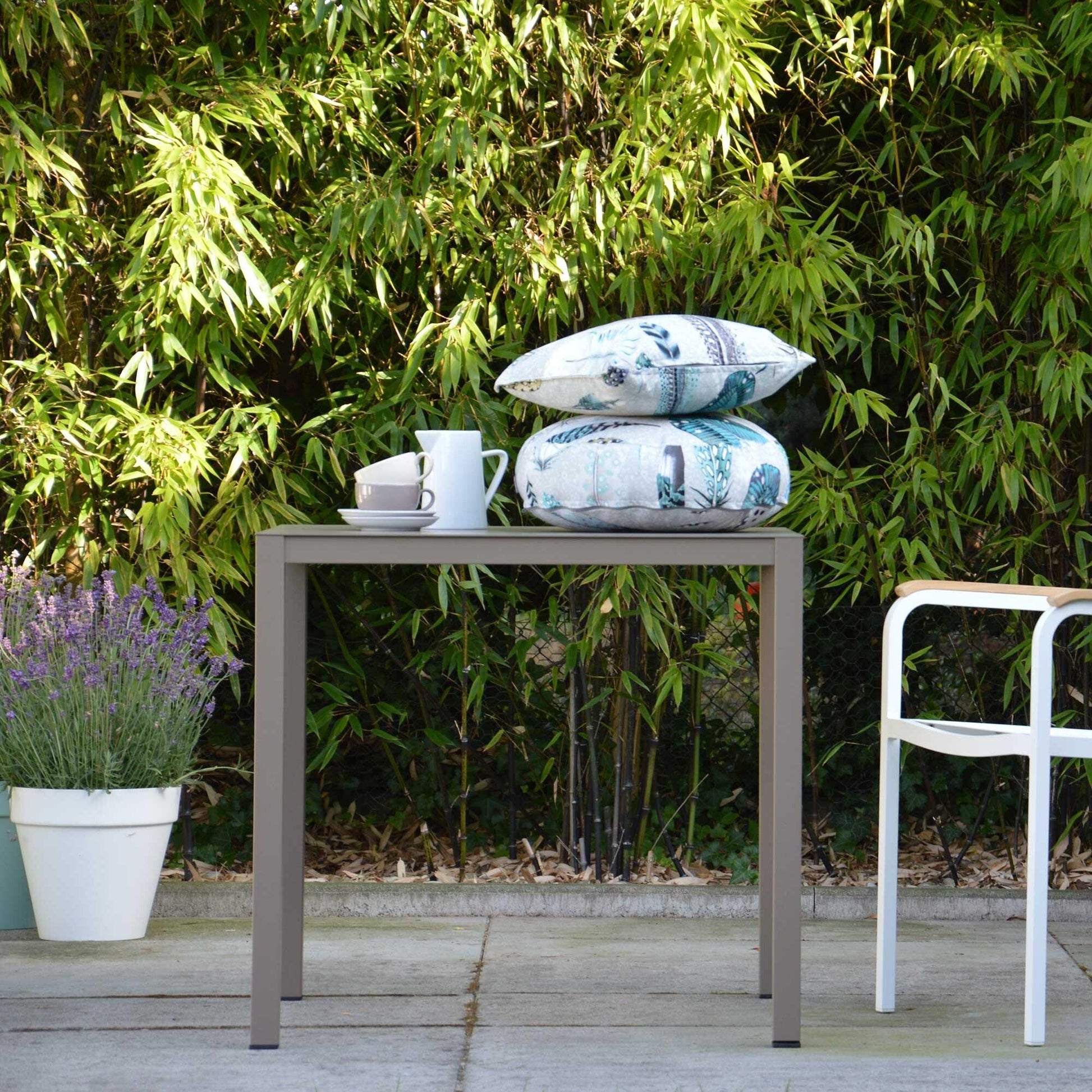 Mit seinen modernen Taupe-, schlichten Schwarz- oder Weiß-Anstrich passt sich der Tisch optimal in jedes Raumverhältnis ein. Die einheitliche Höhe der Tischvarianten ermöglicht es, diese bei Bedarf zu kombinieren, um größere Arbeitsflächen zu erhalten. Durch seine Robustheit und schlichte Eleganz wird der Aria Gartentisch zu einem treuen Begleiter in Ihrem Haushalt.