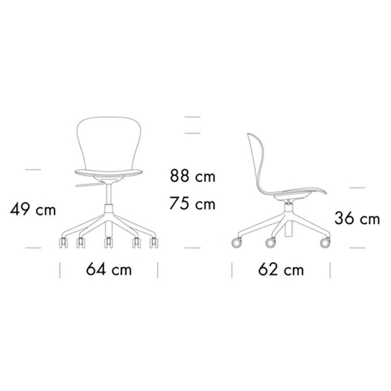 Der S 220 DRW Drehstuhl mit Rollen misst eine Breite von 64cm und eine Tiefe von 62cm. Sein Sitz ist je nach Einstellung 36cm bis 49cm hoch, während die Gesamthöhe zwischen 75cm und 88cm liegt. Der drehbare Stuhl kann bis zu 110kg tragen und hat ein Eigengewicht von 7,3kg. Aus der Kollektion ist auch ein Modell mit Armlehnen erhältlich.